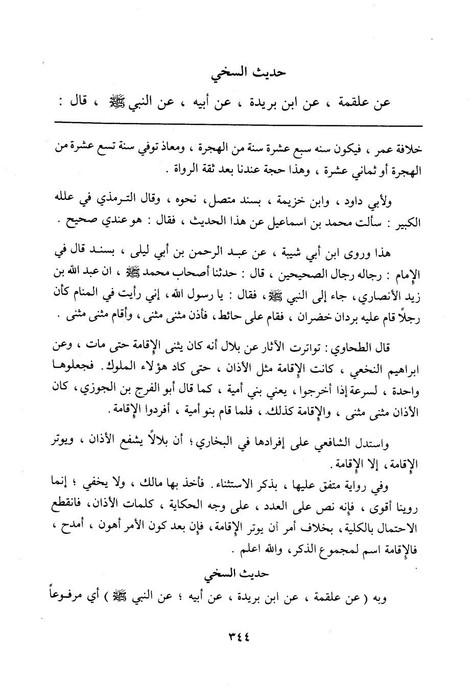 قال الطحاوي: تواترت الآثار عن بلال أنه كان يثني الإقامة حتى مات، وعن إبراهيم النخعي، كانت الإقامة مثل الأذان، حتى كاد هؤلاء الملوك. فجعلوها واحدة، لسرعة إذا أخرجوا، يعني بني أمية، كما قال أبو الفرج بن الجوزي، كان الأذان مثنى مثنى، والإقامة كذلك، فلما قام بنو أمية، أفردوا الإقامة.
