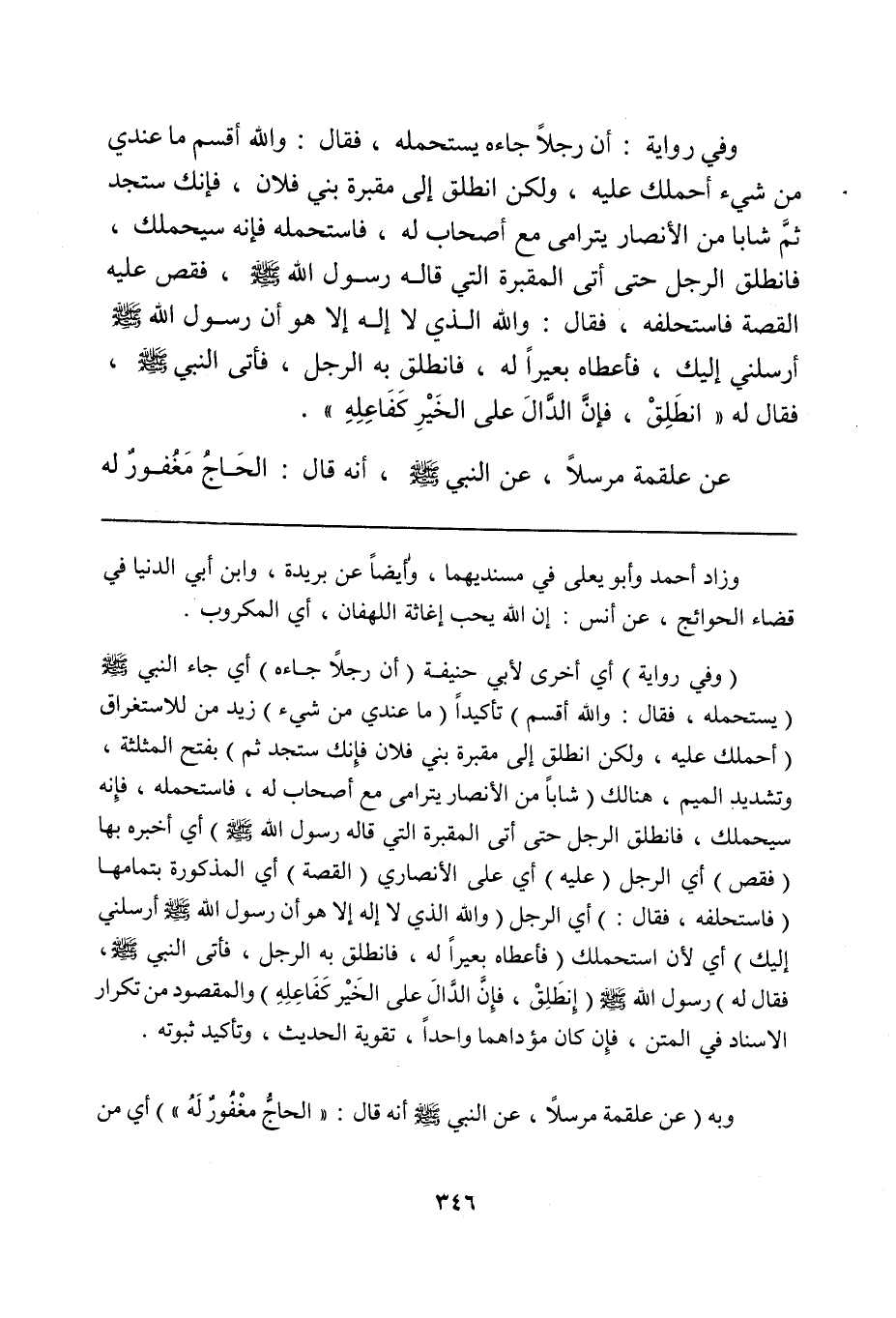 (وفي رواية) أي أخرى لأبي حنيفة (أن رجلاً جاءه) أي جاء النبي صلى الله عليه وسلم (يستحمله، فقال: والله أقسم) تأكيداً (ما عندي من شيء) زيد من للاستغراق (أحملك عليه، ولكن انطلق إلى مقبرة بني فلان فإنك ستجد ثم) بفتح المثلثة، وتشديد الميم، هنالك (شاباً من الأنصار يترامى مع أصحاب له، فاستحمله، فإنه سيحملك، فانطلق الرجل حتى أتى المقبرة التي قاله رسول الله صلى الله عليه وسلم) أي أخبره بها (فقص) أي الرجل (عليه) أي على الأنصاري (القصة) أي المذكورة بتمامها (فاستحلفه، فقال:) أي الرجل (والله الذي لا إله إلا هو أن رسول الله صلى الله عليه وسلم أرسلني إليك) أي لأن أستحملك (فأعطاه بعيراً له، فانطلق به الرجل، فأتى به النبي صلى الله عليه وسلم، فقال له) رسول الله صلى الله عليه وسلم (انطَلِقْ، فإِنَّ الدَّالَ على الخَيْر كَفَاعِلِهِ) والمقصود من تكرار الإسناد في المتن، فإن كان مؤداهما واحداً، تقوية الحديث، وتأكيد ثبوته.