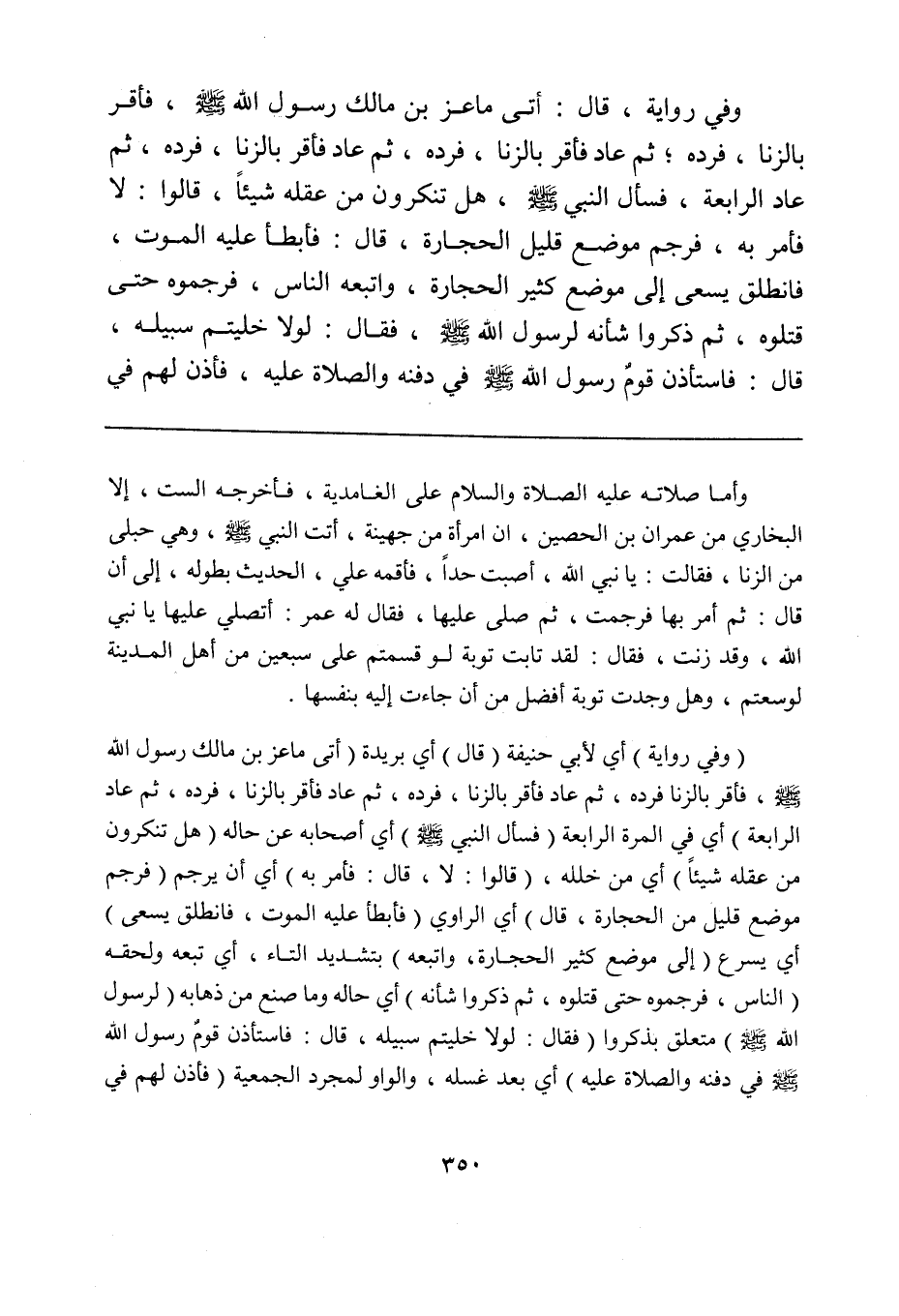 (وفي رواية) أي لأبي حنيفة (قال) أي بريدة (أتى ماعز بن مالك رسول الله صلى الله عليه وسلم، فأقر بالزنا فرده، ثم عاد فأقر بالزنا، فرده، ثم عاد فأقر بالزنا، فرده، ثم عاد الرابعة) أي في المرة الرابعة (فسأل النبي صلى الله عليه وسلم) أي أصحابه عن حاله (هل تنكرون من عقله شيئاً) أي من خلله، (قالوا: لا، قال: فأمر به) أي أن يرجم (فرجم موضع قليل من الحجارة، قال) أي الراوي (فأبطأ عليه الموت، فانطلق يسعى) أي يسرع (إلى موضع كثير الحجارة، واتبعه) بتشديد التاء، أي تبعه ولحقه (الناس، فرجموه حتى قتلوه، ثم ذكروا شأنه) أي حاله وما صنع من ذهابه (لرسول الله صلى الله عليه وسلم) متعلق بذكروا (فقال: لولا خليتم سبيله، قال: فاستأذن قومٌ رسول الله صلى الله عليه وسلم في دفنه والصلاة عليه) أي بعد غسله، والواو لمجرد الجمعية (فأذن لهم في