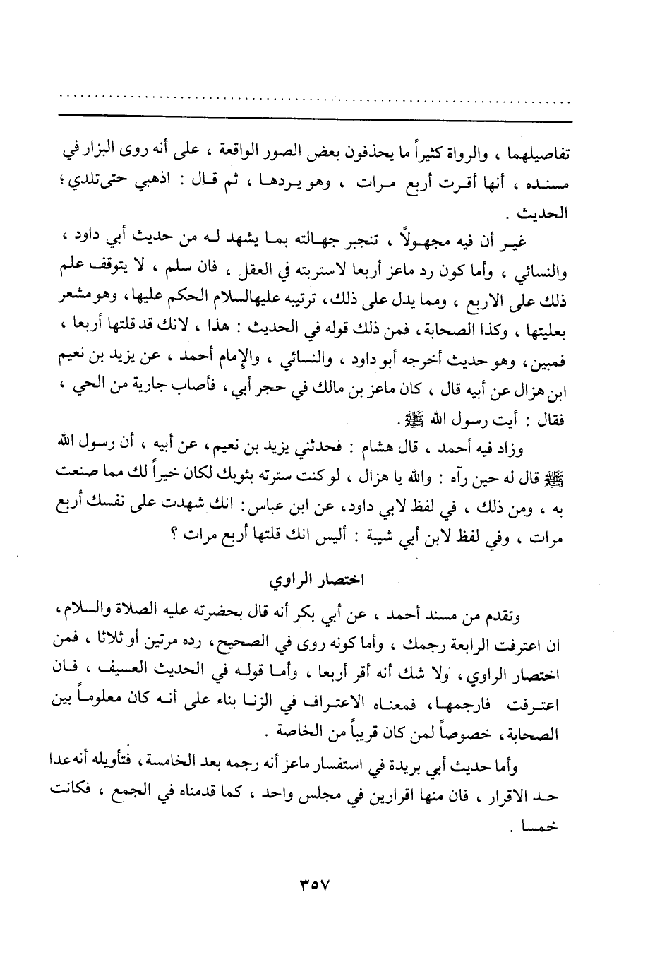 وتقدم من مسند أحمد، عن أبي بكر أنه قال بحضرته عليه الصلاة والسلام، إن اعترفت الرابعة رجمك، وأما كونه روى في الصحيح، رده مرتين أو ثلاثاً، فمن اختصار الراوي، ولا شك أنه أقر أربعاً، وأما قوله في الحديث العسيف، فإن اعترفت فارجمها، فمعناه الاعتراف في الزنا بناء على أنه كان معلوماً بين الصحابة، خصوصاً لمن كان قريباً من الخاصة.