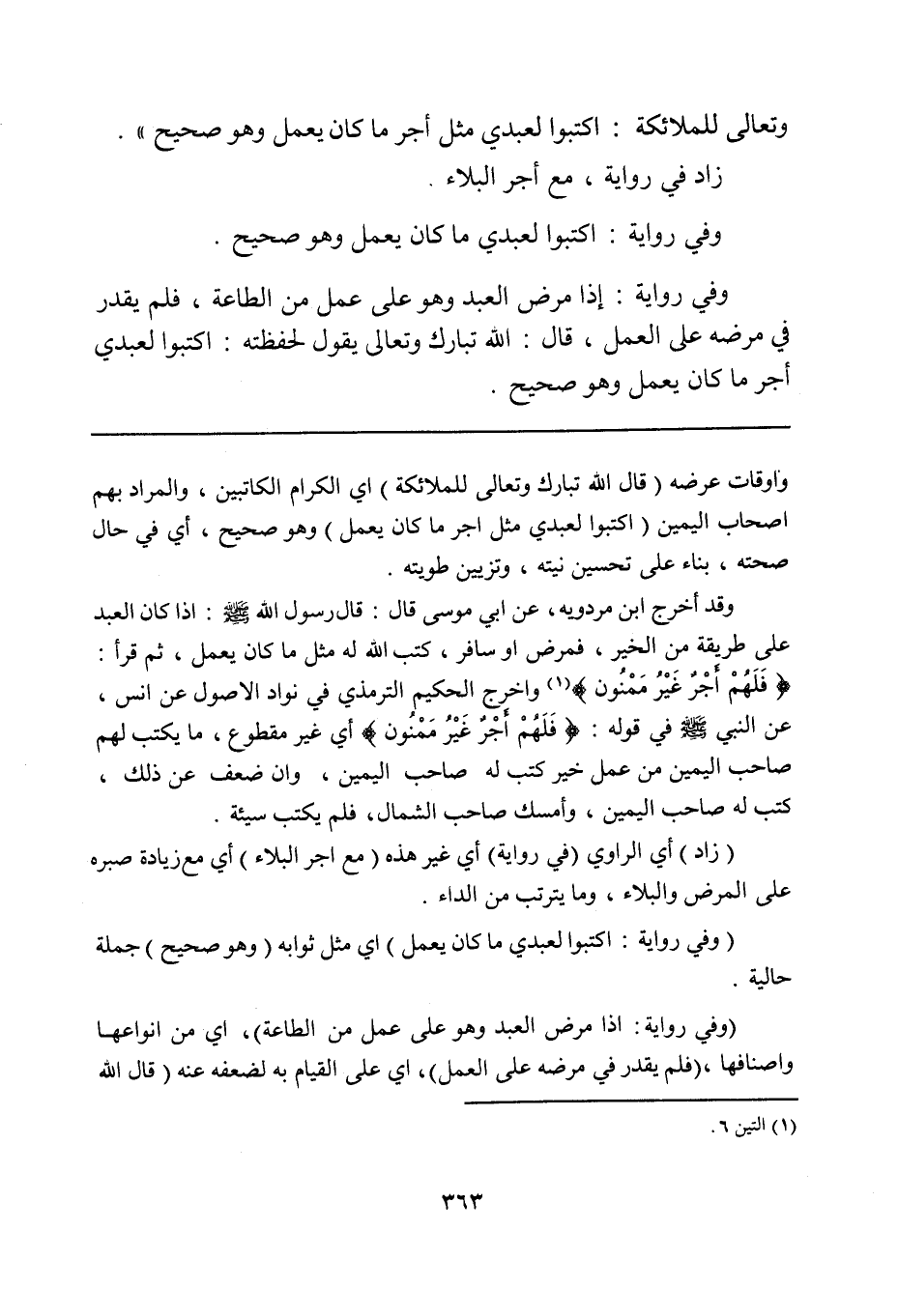 وقد أخرج ابن مردويه، عن أبي موسى قال: قال رسول الله صلى الله عليه وسلم: إذا كان العبد على طريقة من الخير، فمرض أو سافر، كتب الله له مثل ما كان يعمل، ثم قرأ: {فَلَهُمْ أَجْرٌ غَيْرُ مَمْنُون} (¬1) وأخرج الحكيم الترمذي في نوادر الأصول عن أنس، عن النبي صلى الله عليه وسلم في قوله: {فَلَهُمْ أَجْرٌ غَيْرُ مَمْنُون} أي غير مقطوع، ما يكتب لهم صاحب اليمين من عمل خير كتب له صاحب اليمين، وإن ضعف عن ذلك، كتب له صاحب اليمين، وأمسك صاحب الشمال، فلم يكتب سيئة.
