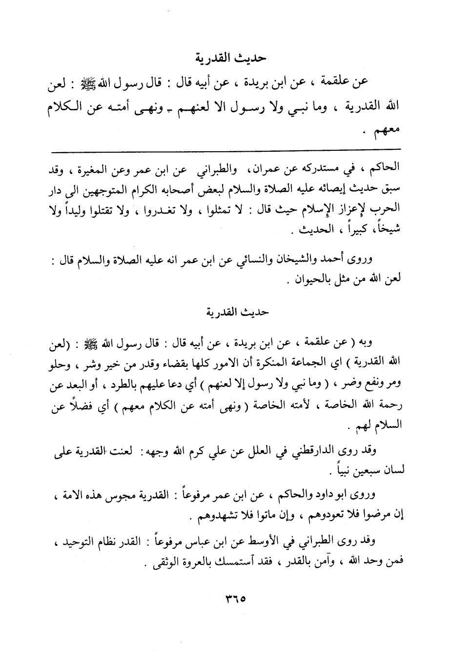 وبه (عن علقمة، عن ابن بريدة، عن أبيه قال: قال رسول الله صلى الله عليه وسلم: (لعن الله القدرية) أي الجماعة المنكرة أن الأمور كلها بقضاء وقدر من خير وشر، وحلو ومر ونفع وضر، (وما نبي ولا رسول إلا لعنهم) أي دعا عليهم بالطرد، أو البعد عن رحمة الله الخاصة، لأمته الخاصة (ونهى أمته عن الكلام معهم) أي فضلاً عن السلام لهم.