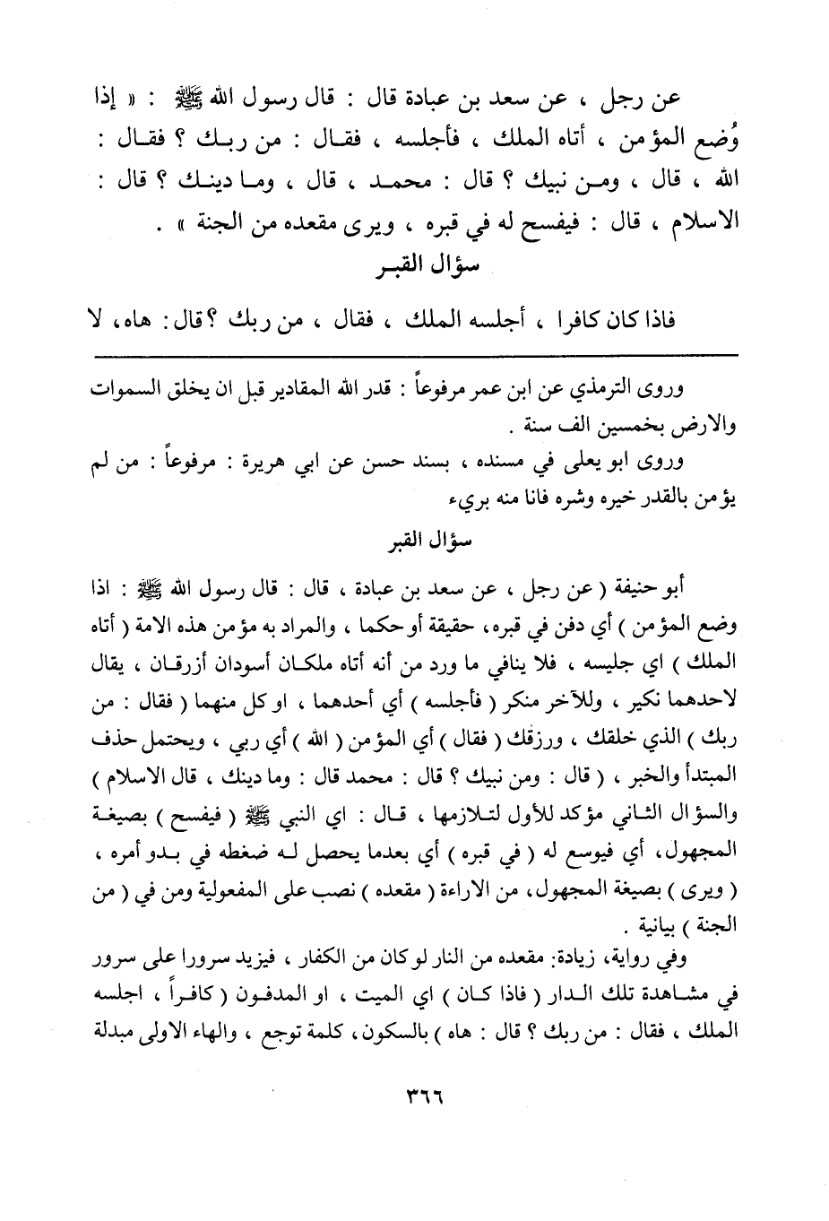 أبو حنيفة (عن رجل، عن سعد بن عبادة، قال: قال رسول الله صلى الله عليه وسلم: إذا وضع المؤمن) أي دفن في قبره، حقيقة أو حكماً، والمراد به مؤمن هذه الأمة (أتاه الملك) أي جليسه، فلا ينافي ما ورد من أنه أتاه ملكان أسودان أزرقان، يقال لأحدهما نكير، وللآخر منكر (فأجلسه) أي أحدهما، أو كل منهما (فقال: من ربك) الذي خلقك، ورزقك (فقال) أي المؤمن (الله) أي ربي، ويحتمل حذف المبتدأ والخبر، (قال: ومن نبيك؟ قال: محمد قال: وما دينك، قال الإسلام) والسؤال الثاني مؤكد للأول لتلازمها، قال: أي النبي صلى الله عليه وسلم (فيفسح) بصيغة المجهول، أي فيوسع له (في قبره) أي بعدما يحصل له ضغطه في بدو أمره، (ويرى) بصيغة المجهول، من الإراءة (مقعده) نصب على المفعولية ومن في (من الجنة) بيانية.