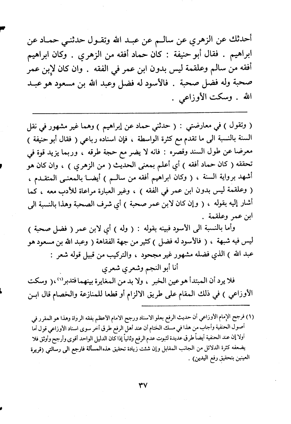 (وتقول) في معارضتي: (حدثني حماد عن إبراهيم) وهما غير مشهورفي نقل السنة بالنسبة إلى ما تقدم مع كثرة الواسطة، فإن إسناده رباعي (فقال أبو حنيفة) معرضاً عن طول السند وقصره: فإنه لا يضر مع حجة طرقه، وربما يزيد قوة في تحققه (كان حماد أفقه) أي أعلم بمعنى الحديث (من الزهري)، وإن كان هو أشهد برواية السنة، (وكان إبراهيم أفقه من سالم) أيضاً بالمعنى المتقدم، (وعلقمة ليس بدون ابن عمر في الفقه)، وغير العبارة مراعاة للأدب معه، كما أشار إليه بقوله، (وإن كان لابن عمر صحبة) أي شرف الصحبة وهذا بالنسبة إلى ابن عمر وعلقمة.
