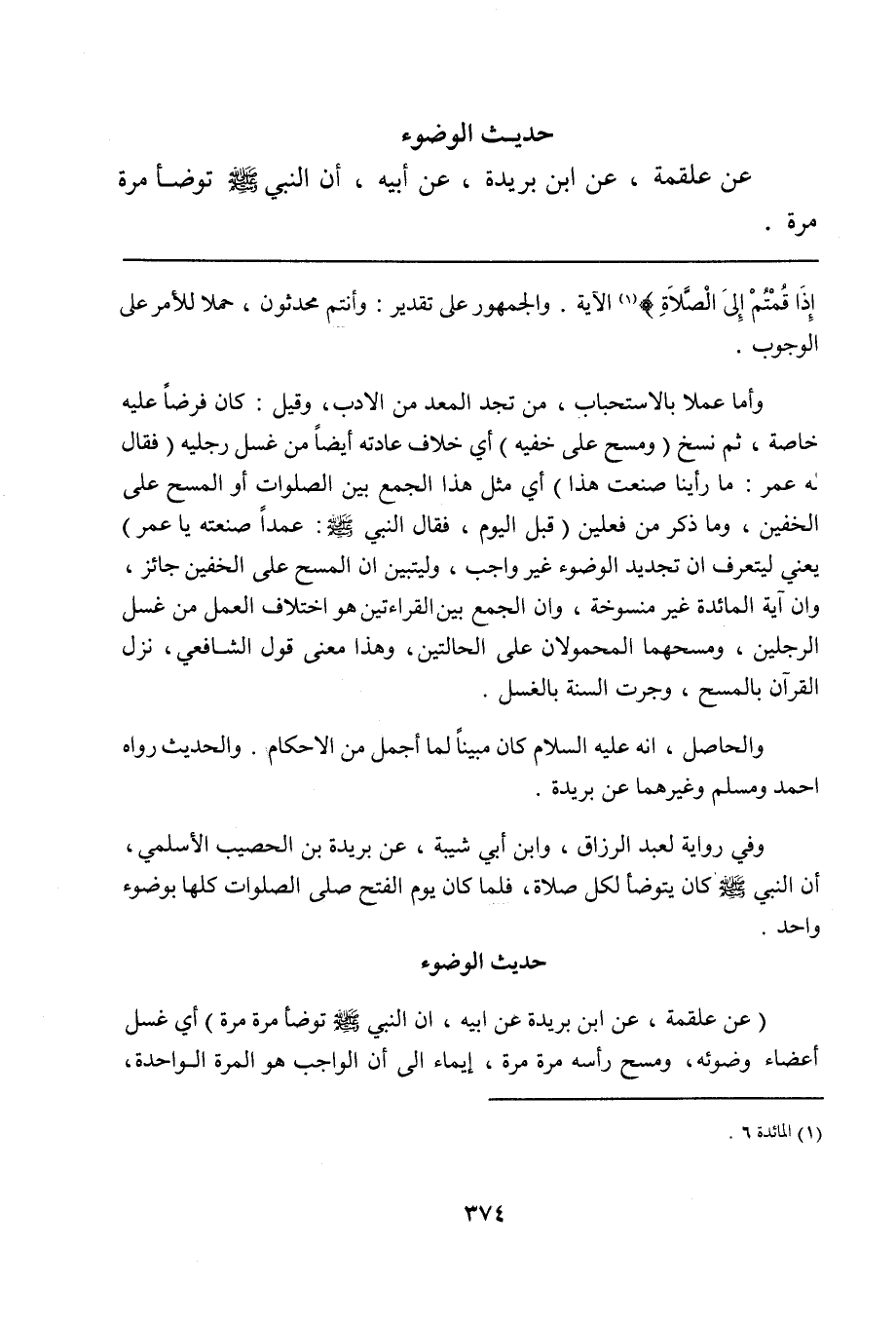 (عن علقمة، عن ابن بريدة عن أبيه، أن النبي صلى الله عليه وسلم توضأ مرة مرة) أي غسل أعضاء وضوئه، ومسح رأسه مرة مرة، إيماء إلى أن الواجب هو المرة الواحدة،