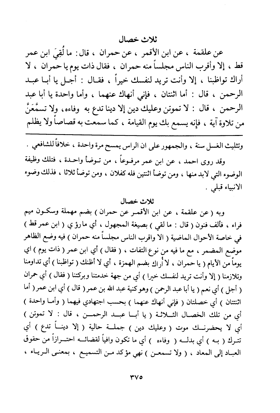 وبه (عن علقمة، عن ابن الأقمر عن حمران) بضم مهملة وسكون ميم فراء، فألف فنون (قال: ما لقي) بصيغة المجهول، أي ما رؤي (ابن عمر قط) في خاصة الأحوال الماضية (إلا وأقرب الناس مجلساً منه حمران) فيه وضع الظاهر موضع المضمر، مع ما فيه من نوع التفات، (فقال) أي ابن عمر (ذات يوم) أي يوماً من الأيام (يا حمران، لا أُراك) بضم الهمزة، أي لا أظنك (تواظبنا) أي تداومنا وتلازمنا (إلا وأنت تريد لنفسك خيراً) أي من جهة خدمتنا وبركتنا (فقال) أي حمران (أجل) أي نعم (يا أبا عبد الرحمن) وهو كنية عبد الله بن عمر (قال) أي ابن عمر (وأما اثنتان) أي خصلتان (فإني أنهاك عنهما) بحسب اجتهادي فيهما (وأما واحدة) أي من تلك الخصال الثلاثة (يا أبا عبد الرحمن، قال: لا تموتن) أي لا يحضرنك موت (وعليك دين) جملة حالية (إلا ديناً تدع) أي تترك (به) أي بدله (وفاءه) أي ما تكون وافياً لقضائه احترازاً من حقوق العباد إلى المعاد، (ولا تسمعن) نهي مؤكد من التسميع، بمعنى الرياء،