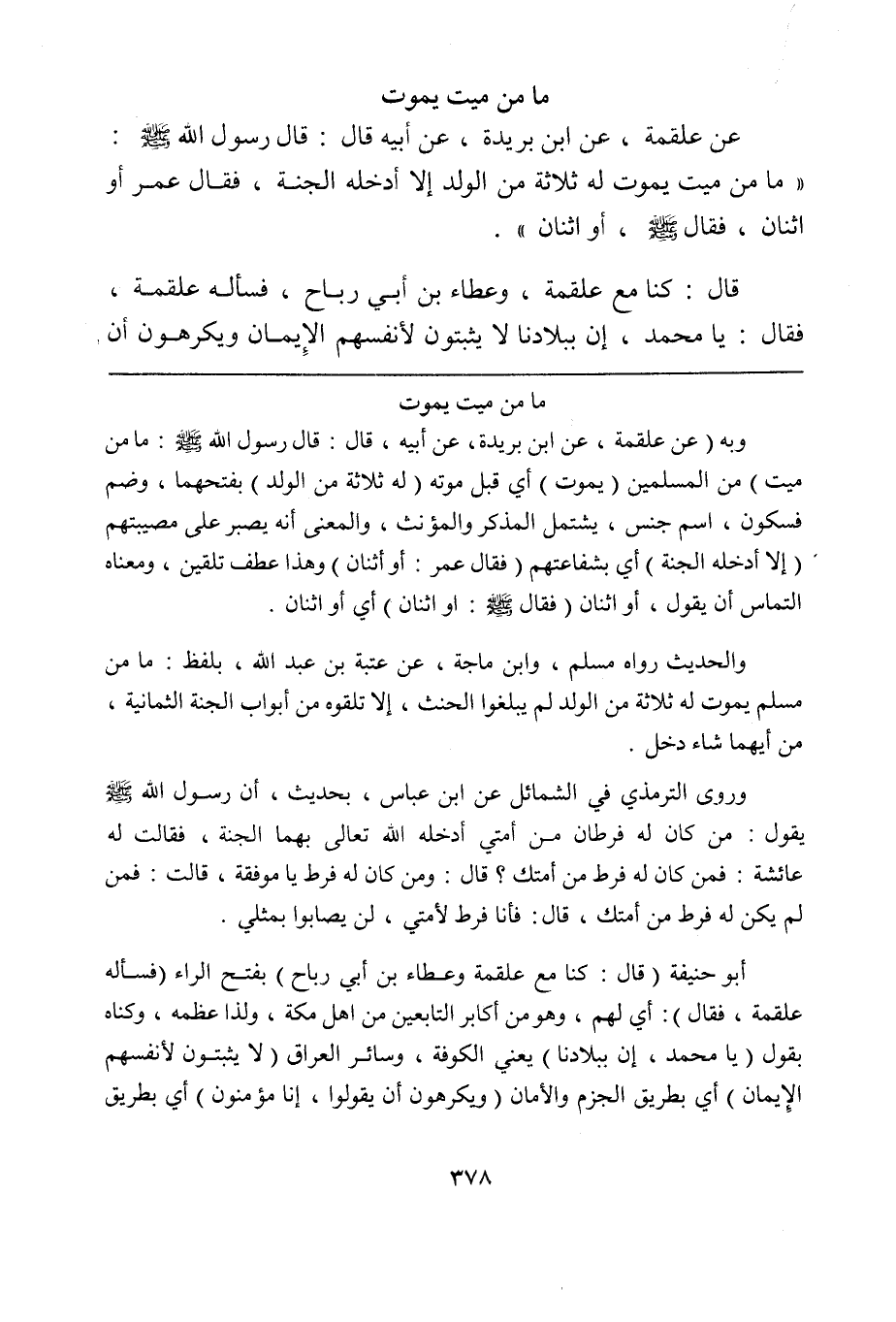 وبه (عن علقمة، عن ابن بريدة، عن أبيه، قال: قال رسول الله صلى الله عليه وسلم: ما من ميت) من المسلمين (يموت) أي قبل موته (له ثلاثة من الولد) بفتحهما، وضم فسكون، اسم جنس، يشتمل المذكر والمؤنث، والمعنى أنه يصبر على مصيبتهم (إلا أدخله الجنة) أي بشفاعتهم (فقال عمر: أو اثنان) وهذا عطف تلقين، ومعناه التماس أن يقول، أو اثنان (فقال صلى الله عليه وسلم: أو اثنان) أي أو اثنان.