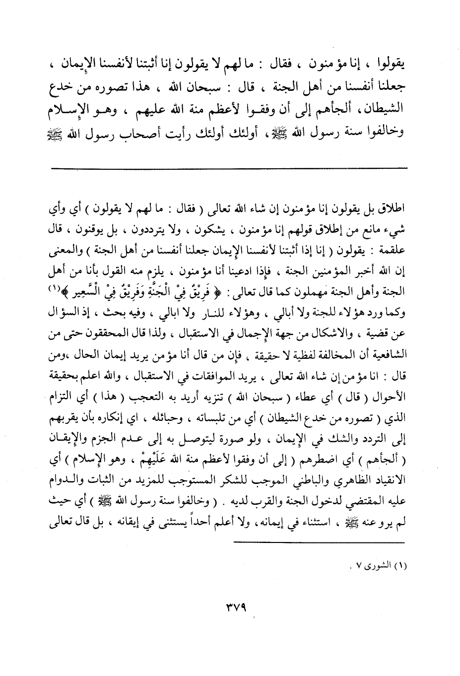 إطلاق بل يقولون إنا مؤمنون إن شاء الله تعالى (فقال: ما لهم لا يقولون) أي وأي شيء مانع من إطلاق قولهم إنا مؤمنون، يشكون، ولا يترددون، بل يوقنون، قال علقمة: يقولون (إنا إذا أثبتنا لأنفسنا الإيمان جعلنا أنفسنا من أهل الجنة) والمعنى إن الله أخبر المؤمنين الجنة، فإذا ادعينا أنا مؤمنون، يلزم منه القول بأنا من أهل الجنة وأهل الجنة مهملون كما قال تعالى: {فَرِيْقٌ فِيْ الْجَنَّةِ وَفَرِيْقٌ فِيْ الْسَّعِير} (¬1) وكما ورد هؤلاء للجنة ولا أبالي، وهؤلاء للنار ولا أبالي، وفيه بحث، إذ السؤال عن قضية، والإشكال من جهة الإجمال في الاستقبال، ولذا قال المحققون حتى من الشافعية أن المخالفة لفظية لا حقيقة، فإن من قال أنا مؤمن يريد إيمان الحال، ومن قال: أنا مؤمن إن شاء الله تعالى، يريد الموافقات في الاستقبال، والله أعلم بحقيقة الأحوال (قال) أي عطاء (سبحان الله) تنزيه أريد به التعجب (هذا) أي التزام الذي (تصوره من خدع الشيطان) أي من تلبساته، وحبائله، أي إنكاره بأن يقربهم إلى التردد والشك في الإيمان، ولو صورة ليتوصل به إلى عدم الجزم والإيقان (ألجأهم) أي اضطرهم (إلى أن وفقوا لأعظم منة الله عَلَيْهِمْ، وهو الإسلام) أي الانقياد الظاهري والباطني الموجب للشكر المستوجب للمزيد من الثبات والدوام عليه المقتضي لدخول الجنة والقرب لديه. (وخالفوا سنة رسول الله صلى الله عليه وسلم) أي حيث لم يرو عنه صلى الله عليه وسلم، استثناء في إيمانه، ولا أعلم أحداً يستثنى في إيقانه، بل قال تعال