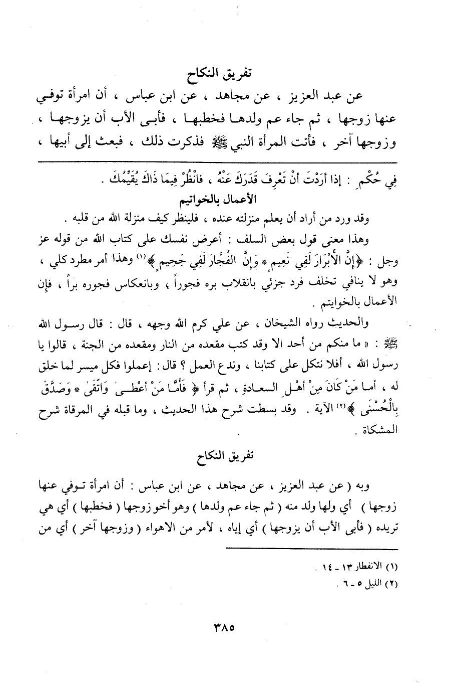 وهذا معنى قول بعض السلف: اعرض نفسك على كتاب الله من قوله عز وجل: {إِنَّ الأَبْرَارَ لَفِي نَعِيمٍ ... وَإِنَّ الفُجَّارَ لَفِي جَحِيمٍ} (¬1) وهذا أمر مطرد كلي، وهو لا ينافي تخلف فرد جزئي بانقلاب بره فجوراً، وبانعكاس فجوره براً، فإن الأعمال بالخواتيم.