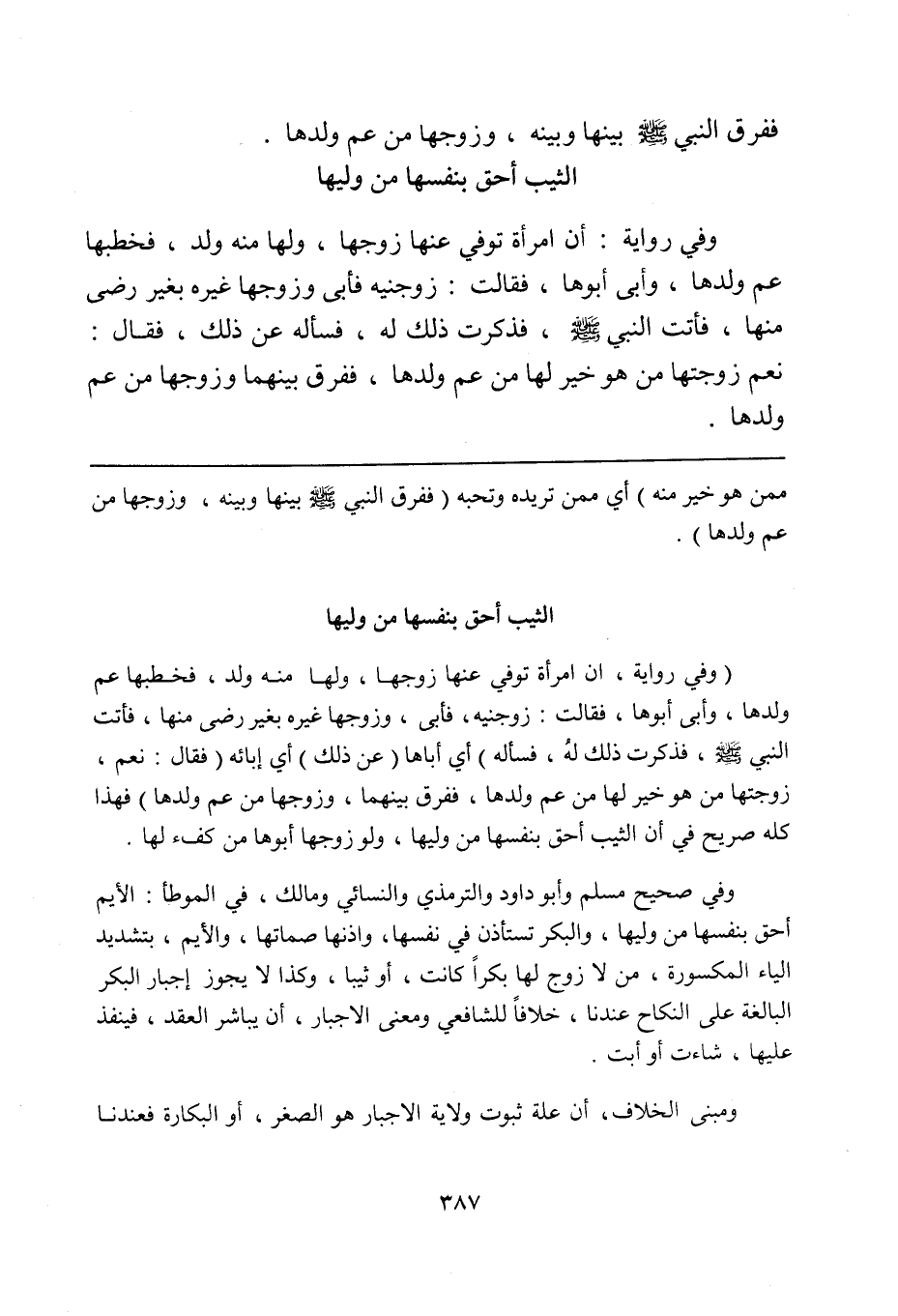 (وفي رواية، أن امرأة توفي عنها زوجها، ولها منه ولد، فخطبها عم ولدها، وأبى أبوها، فقالت: زوجنيه، فأبى، وزوجها غيره بغير رضى منها، فأتت النبي صلى الله عليه وسلم، فذكرت ذلك لهُ، فسأله) أي أباها (عن ذلك) أي إبائه (فقال: نعم، زوجتها من هو خير لها من عم ولدها، ففرق بينهما، وزوجها من عم ولدها) فهذا كله صريح في أن الثيب أحق بنفسها من وليها، ولو زوجها أبوها من كفء لها.