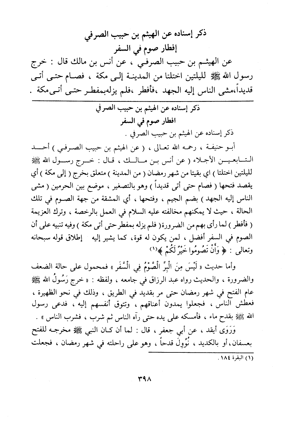 أبو حنيفة، رحمه الله تعالى، (عن الهيثم بن حبيب الصرفي) أحد التابعين الأجلاء (عن أنس بن مالك، قال: خرج رسول الله صلى الله عليه وسلم لليلتين اختلتا) أي بقيتا من شهر رمضان (من المدينة) متعلق بخرج (إلى مكة) أي يقصد فتحها (فصام حتى أتى قديداً) وهو بالتصغير، موضع بين الحرمين (مشى الناس إليه الجهد) بضم الجيم، وفتحها، أي المشقة من جهة الصوم في تلك الحالة، حيث لا يمكنهم مخالفته عليه السلام في العمل بالرخصة، وترك العزيمة (فأفطر) لما رأى بهم من الضرورة (فلم يزله بمفطر حتى أتى مكة) وفيه تنبيه على أن الصوم في السفر أفضل، لمن يكون له قوة، كما يشير إليه إطلاق قوله سبحانه وتعالى: {وَأَنْ تَصُومُوا خَيْرٌ لَكُمْ} (¬1).