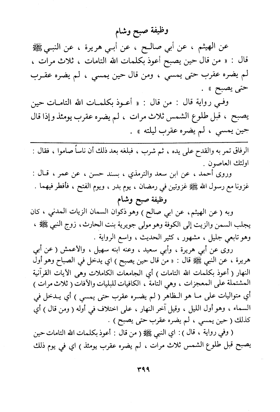 روى عن أبي هريرة، وأبي سعيد، وعنه ابنه سهيل، والأعمش (عن أبي هريرة، عن النبي صلى الله عليه وسلم قال: "من قال حين يصبح) أي يدخل في الصباح وهو أول النهار (أعوذ بكلمات الله التامات) أي الجامعات الكاملات وهي الآيات القرآنية المشتملة على المعجزات، وهي التامة، الكافيات للبليات والآفات (ثلاث مرات) أي متواليات على ما هو الظاهر (لم يضره عقرب حتى يمسي) أي يدخل في المساء، وهو أول الليل، وقيل آخر النهار، على اختلاف في أوله (ومن قال) أي كذلك (حين يمسي، لم يضره عقرب حتى يصبح).