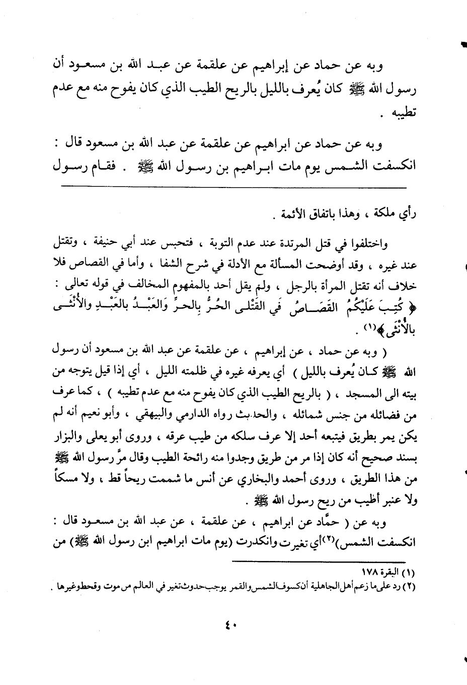 (وبه عن حماد، عن إبراهيم، عن علقمة عن عبد الله بن مسعود أن رسول الله صلى الله عليه وسلم كان يُعرف بالليل) أي يعرفه غيره في ظلمة الليل، أي إذا قيل يتوجه من بيته إلى المسجد، (بالريح الطيب الذي كان يفوح منه مع عدم تطيبه)، كما عرف من فضائله من جنس شمائله، والحديث رواه الدارمي والبيهقي، وأبو نعيم أنه لم يكن يمر بطريق فيتبعه أحد إلا عرف سلكه من طيب عرقه، وروى أبو يعلى والبزار بسند صحيح أنه كان إذا مر من طريق وجدوا منه رائحة الطيب وقال مرَّ رسول الله صلى الله عليه وسلم من هذا الطريق، وروى أحمد والبخاري عن أنس ما شممت ريحاً قط، ولا مسكاً ولا عنبر أطيب من ريح رسول الله صلى الله عليه وسلم.