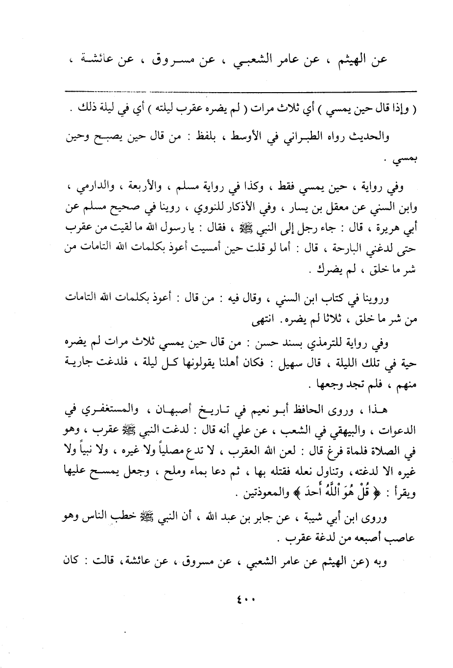 هذا، وروى الحافظ أبو نعيم في تاريخ أصبهان، والمستغفري في الدعوات، والبيهقي في الشعب، عن علي أنه قال: لدغت النبي صلى الله عليه وسلم عقرب، وهو في الصلاة فلما فرغ قال: لعن الله العقرب، لا تدع مصلياً ولا غيره، ولا نبياً ولا غيره إلا لدغته، وتناول نعله فقتله بها، ثم دعا بماء وملح، وجعل يمسح عليها ويقرأ: {قُلْ هُوَ الله أَحدَ} والمعوذتين.