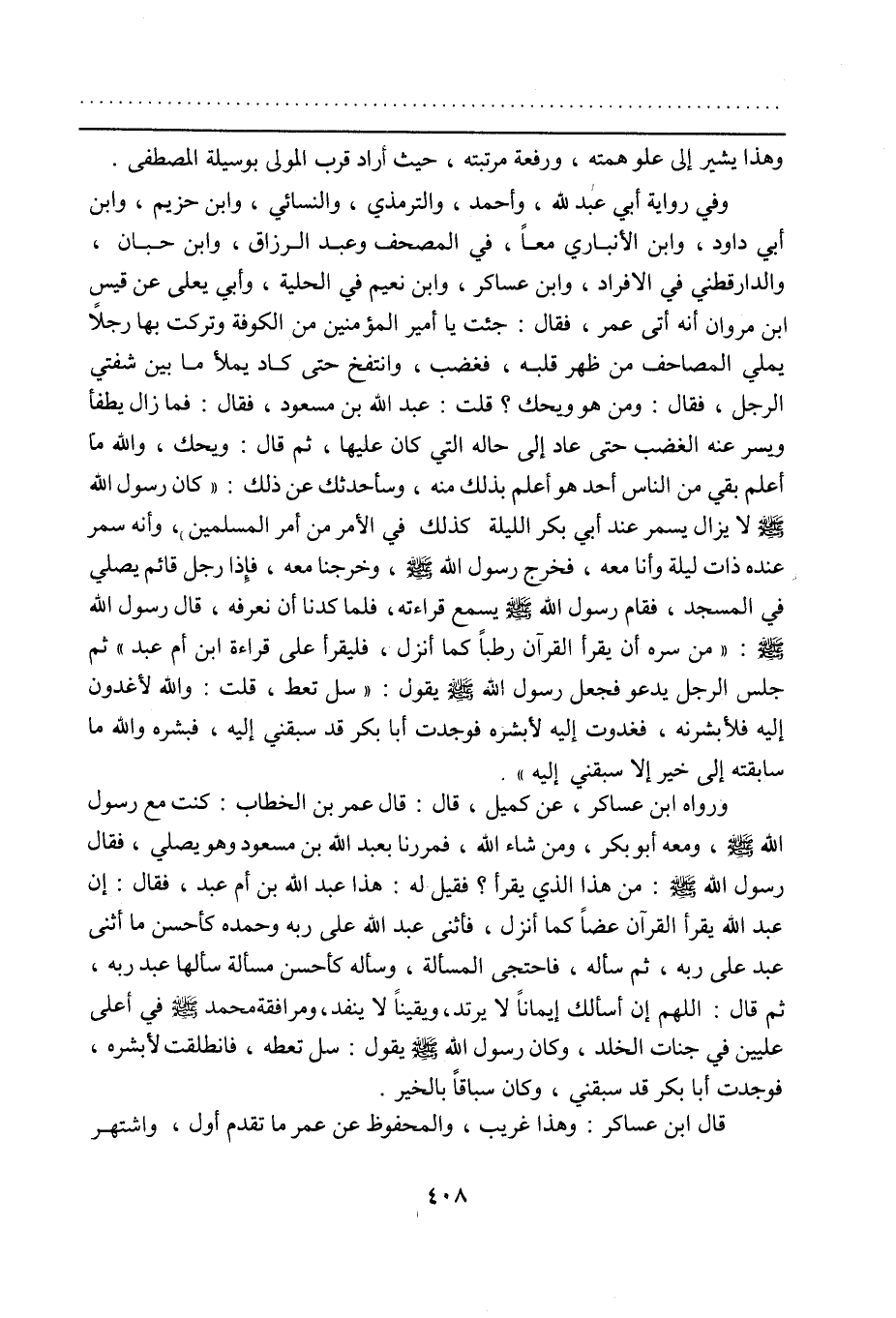 وفي رواية أبي عبد الله، وأحمد، والترمذي، والنسائي، وابن حزيم، وابن أبي داود، وابن الأنباري معاً، في المصحف وعبد الرزاق، وابن حبان، والدارقطني في الأفراد، وابن عساكر، وابن نعيم في الحلية، وأبي يعلى عن قيس ابن مروان أنه أتى عمر، فقال: جئت يا أمير المؤمنين من الكوفة وتركت بها رجلاً يملي المصاحف من ظهر قلبه، فغضب، وانتفخ حتى كاد يملأ ما بين شفتي الرجل، فقال: ومن هو ويحك؟ قلت: عبد الله بن مسعود، فقال: فما زال يطفأ ويسر عنه الغضب حتى عاد إلى حاله التي كان عليها، ثم قال: ويحك، والله ما أعلم بقي من الناس أحد هو أعلم بذلك منه، وسأحدثك عن ذلك: "كان رسول الله صلى الله عليه وسلم لا يزال يسمر عند أبي بكر الليلة كذلك في الأمر من أمر المسلمين، وأنه سمر عنده ذات ليلة وأنا معه، فخرج رسول الله صلى الله عليه وسلم، وخرجنا معه، فإذا رجل قائم يصلي في المسجد، فقام رسول الله صلى الله عليه وسلم يسمع قراءته، فلما كدنا أن نعرفه، قال رسول الله صلى الله عليه وسلم: "من سره أن يقرأ القرآن رطباً كما أنزل، فليقرأ على قراءة ابن أم عبد" ثم جلس الرجل يدعو فجعل رسول الله صلى الله عليه وسلم يقول: "سل تعط، قلت: والله لأغدون إليه فلأبشرنه، فغدوت إليه لأبشره فوجدت أبا بكر قد سبقني إليه، فبشره والله ما سابقته إلى خير إلا سبقني إليه".