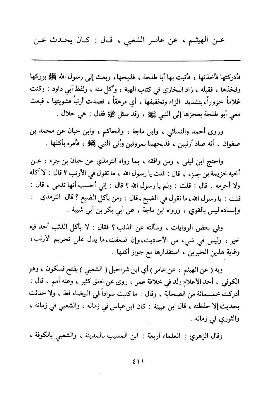 وبه (عن الهيثم، عن عامر) أي شراحيل (الشعبي) بفتح فسكون، وهو الكوفي، أحد الأعلام ولد في خلافة عمر، روى عن خلق كثير، وعنه أمم، قال: أدركت خمسمائة من الصحابة، وقال: ما كتبت سواداً في البيضاء قط، ولا حدثت بحديث إلا حفظته، قال ابن عيينة: كان ابن عباس في زمانه، والشعبي في زمانه، والثوري في زمانه.