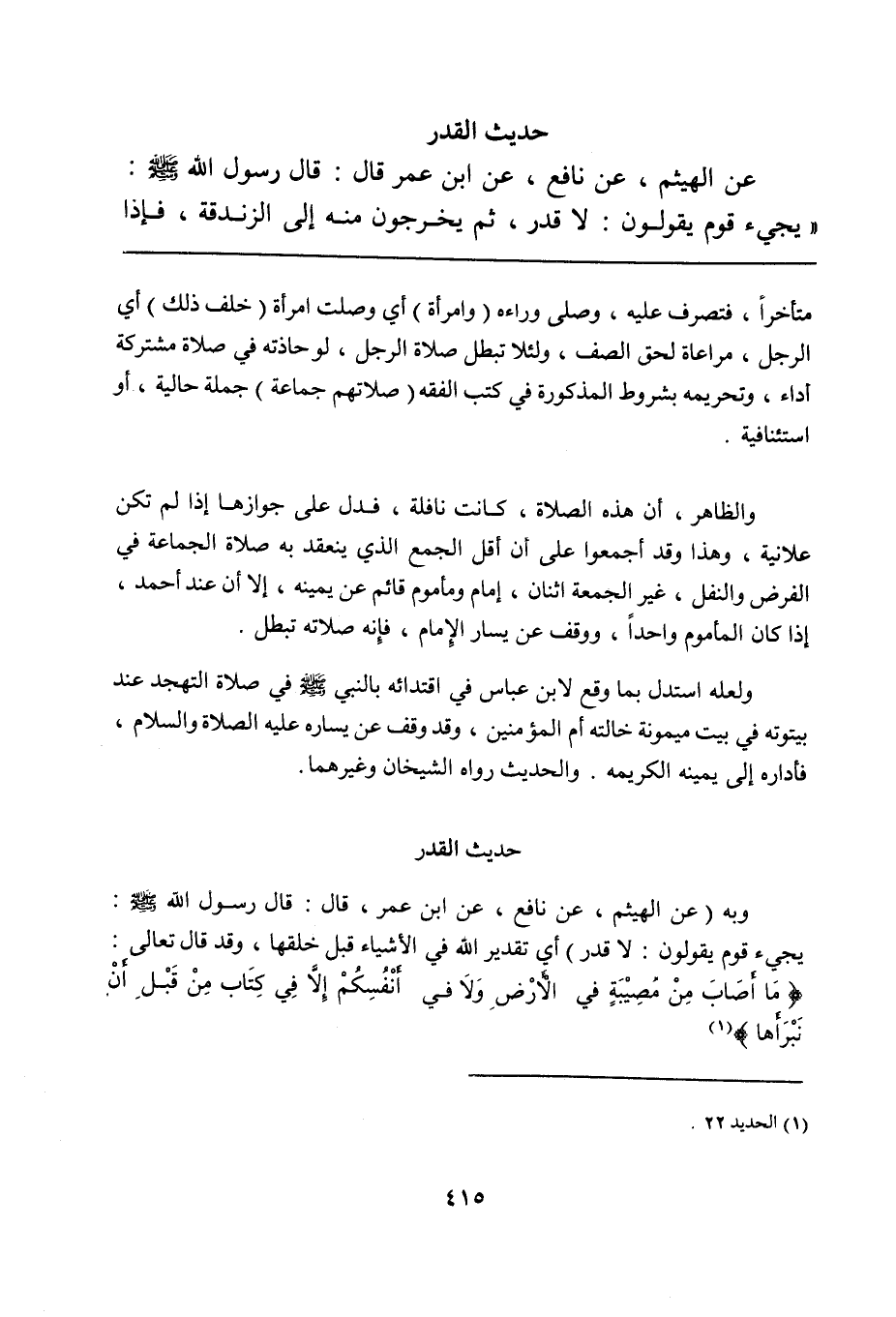 وبه (عن الهيثم، عن نافع، عن ابن عمر، قال: قال رسول الله صلى الله عليه وسلم: يجيء قوم يقولون: لا قدر) أي تقدير الله في الأشياء قبل خلقها، وقد قال تعالى: {مَا أَصَابَ مِنْ مُصِيبَةٍ في الأَرْضِ وِلاَ في أَنْفُسِكُمْ إِلاَّ فِي كِتاَب مِنْ قَبْلِ أَنْ نَبْرَأَها} (¬1).