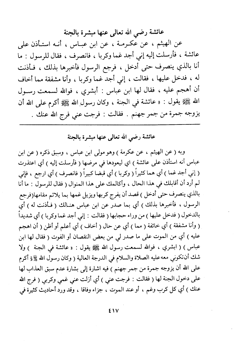 وبه (عن الهيثم، عن عكرمة) وهو مولى ابن عباس، وسبق ذكره (عن ابن عباس أنه استأذن على عائشة) أي ليعودها في مرضها (فأرسلت إليه) أي اعتذرت (إني أجد غماً) أي هماً كثيراً (وكرباً) أي قبضاً كبيراً (فانصرف) أي ارجع، فإني لم أرد أن أقابلك في هذا الحال، وأكالمك على هذا المنوال (فقال للرسول: ما أنا بالذي ينصرف حتى أدخل) قصد أن يفرج كربها ويزيل غمها بما يلائم مقامها (فرجع الرسول، فأخبرها بذلك) أي بما صدر عن ابن عباس هنالك (فأذنت له) أي بالدخول (فدخل عليها) من وراء حجابها (فقالت: إني أجد غماً وكرباً) أي شديداً (وأنا مشفقة) أي خائفة (مما) أي عن حال (أخاف) أي أعلم وأظن (أن أهجم عليه) أي من الموت على ما صدر لي من بعض النقصان أو الفوت (فقال لها ابن عباس: أبشري، فوالله لسمعت رسول الله صلى الله عليه وسلم يقول: "عائشة في الجنة) ولا شك أن تكوني معه عليه الصلاة والسلام في الدرجة العالية (وكان رسول الله صلى الله عليه وسلم أكرم على الله أن يزوجه جمرة من جمر جهنم) فيه إشارة إلى بشارة عدم سبق العذاب لها على دخول الجنة لها (فقالت: فرجت عني) أي أزلت عني غمي وكربي (فرج الله عنك) أي كل كرب وغم، أو عند الموت، جزاءً وفاقاً، وقد ورد أحاديث كثيرة في