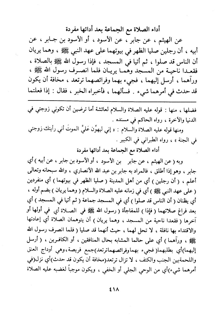 وبه (عن الهيثم، عن جابر بن الأسود، أو الأسود بن جابر، عن أبيه) أي جابر، وهو إذا أطلق، فالمراد به جابر بن عبد الله الأنصاري، والله سبحانه وتعالى أعلم، (أن رجلين) أي من أهل المدينة (صليا الظهر في بيوتهما) أي منفردين (على عهد النبي صلى الله عليه وسلم) أي في زمانه عليه الصلاة والسلام (وهما يريان) بضم أوله، أي يظنان (أن الناس قد صلوا) أي في المسجد جماعة (ثم أتيا في المسجد) أي بعد فراغ صلاتهما (فإذا) للمفاجأة (رسول الله صلى الله عليه وسلم في الصلاة) أي في أولها أو آخرها (فقعدا ناحية من المسجد، وهما يريان) أن يتوهمان الصلاة أي إعادتها والاقتداء بها نافلة، لا تحل لهما، حيث أنهما قد صليا (فلما انصرف رسول الله صلى الله عليه وسلم، ورآهما) أي على حالهما المشابه بحال المنافقين، أو الكافرين، (أرسل إليهما) أي بطلبهما (فجيء بهما وفرائصهما ترتعد) جمع فريصة، وهي أوداج العنق واللحمة بين الجنب والكتف، لا تزال ترتعد (مخافة أن يكون قد حدث) أي نزل (في أمرهما شيء) أي من الوحي الجلي أو الخفي، ويكون موجباً لغضبه عليه الصلاة