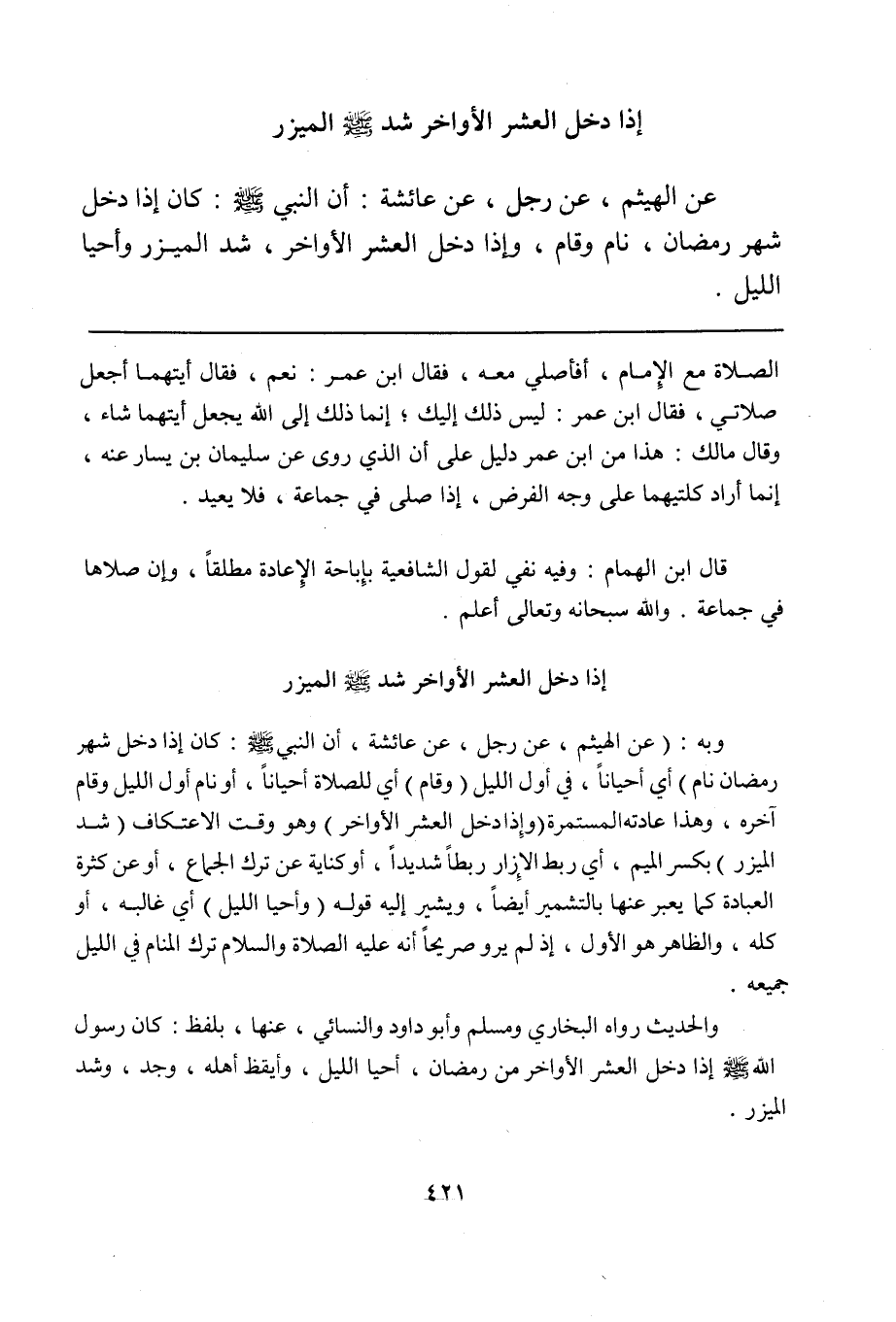 - إذا دخل العشر الأواخر شد صلى الله عليه وسلم الميزر