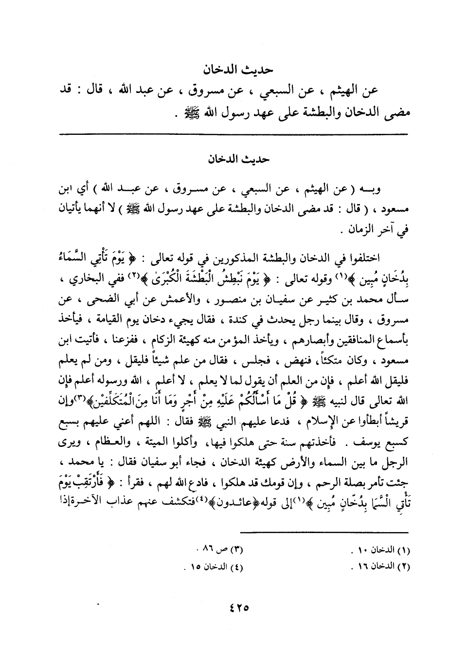 اختلفوا في الدخان والبطشة المذكورين في قوله تعالى: {يَوْمَ تَأْتي السَّمَاءُ بِدُخَانٍ مُبِين} (¬1) وقوله تعالى: {يَوْمَ نَبْطِشُ الْبَطْشَةَ الْكُبْرَى} (¬2) ففي البخاري، سأل محمد بن كثير عن سفيان بن منصور، والأعمش عن أبي الضحى، عن مسروق، وقال بينما رجل يحدث في كندة، فقال يجيء دخان يوم القيامة، فيأخذ بأسماع المنافقين وأبصارهم، ويأخذ المؤمن منه كهيئة الزكام، ففزعنا، فأتيت ابن مسعود، وكان متكئاً، فنهض، فجلس، فقال من علم شيئاً فليقل، ومن لم يعلم فليقل الله أعلم، فإن من العلم أن يقول لما لا يعلم، لا أعلم، الله ورسوله أعلم فإن الله تعال قال لنبيه صلى الله عليه وسلم {قُلْ مَا أَسْأَلُكُمْ عَلَيهِ مِنْ أَجْرٍ وَمَا أَنَا مِنَ المُتَكَلِّفين} (¬3) وإن قريشاً أبطأوا عن الإسلام، فدعا عليهم النبي صلى الله عليه وسلم فقال: اللهم أعني عليهم بسبع كسبع يوسف. فأخذتهم سنة حتى هلكوا فيها، وأكلوا الميتة، والعظام، ويرى الرجل ما بين السماء والأرض كهيئة الدخان، فجاء أبو سفيان فقال: يا محمد، جئت تأمر بصلة الرحم، وإن قومك قد هلكوا، فادع الله لهم، فقرأ: {فَارتَقِبْ يَوْمَ تَأْتِي السَّمَاءُ بِدُخّانٍ مُبِينٍ} إلى قوله {عائدون} فتكشف عنهم عذاب الآخرة إذا