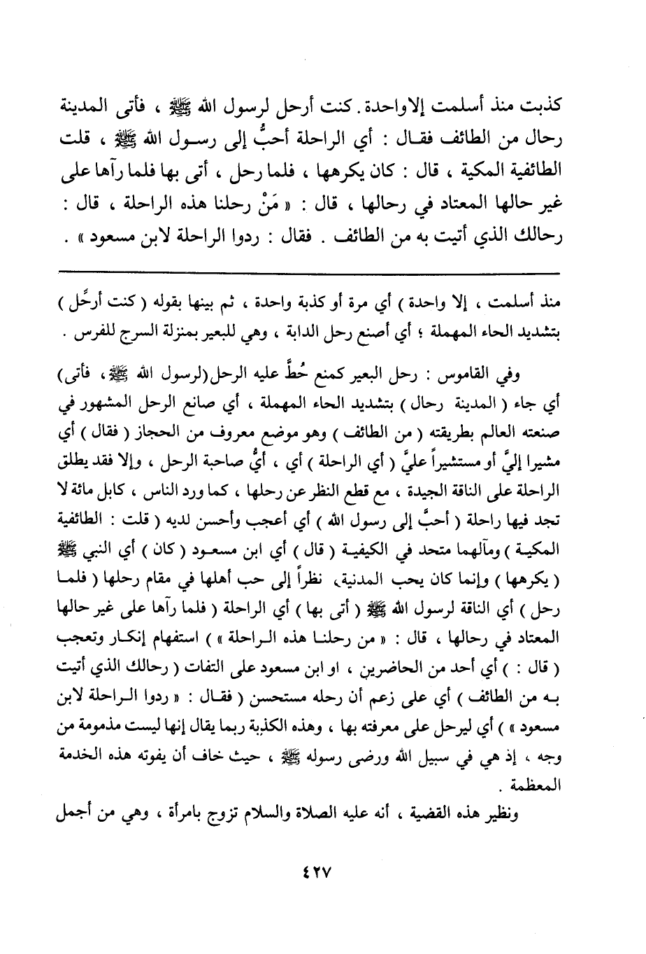 وفي القاموس: رحل البعير كمنع حُطَّ عليه الرحل (لرسول الله صلى الله عليه وسلم، فأتى) أي جاء (المدينة رحال) بتشديد الحاء المهملة، أي صانع الرحل المشهور في صنعته العلم بطريقته (من الطائف) وهو موضع معروف من الحجاز (فقال) أي مشيراً إليَّ أو مستشيراً عليَّ (أي الراحلة) أي، أيُّ صاحبة الرحل، وإلا فقد يطلق الراحلة على الناقة الجيدة، مع قطع النظر عن رحلها، كما ورد الناس، كإبل مائة لا تجد فيها راحلة (أحبُّ إلى رسول الله) أي أعجب وأحسن لديه (قلت: الطائفية المكية) ومآلهما متحد في الكيفية (قال) أي ابن مسعود (كان) أي النبي صلى الله عليه وسلم (يكرهها) وإنما كان يحب المدينة، نظراً إلى حب أهلها في مقام رحلها (فلما رحل) أي الناقة لرسول الله صلى الله عليه وسلم (أتى بها) أي الراحلة (فلما رآها على غير حالها المعتاد في رحالها، قال: "من رحلنا هذه الراحلة") استفهام إنكار وتعجب (قال:) أي أحد من الحاضرين، او ابن مسعود على التفات (رحالك الذي أتيت به من الطائف) أي على زعم أن رحله مستحسن (فقال: "ردوا الراحلة لابن مسعود") أي ليرحل على معرفته بها، وهذه الكذبة ربما يقال إنها ليست مذمومة من وجه، إذ هي في سبيل الله ورضى رسوله صلى الله عليه وسلم، حيث خاف أن يفوته هذه الخدمة المعظمة.