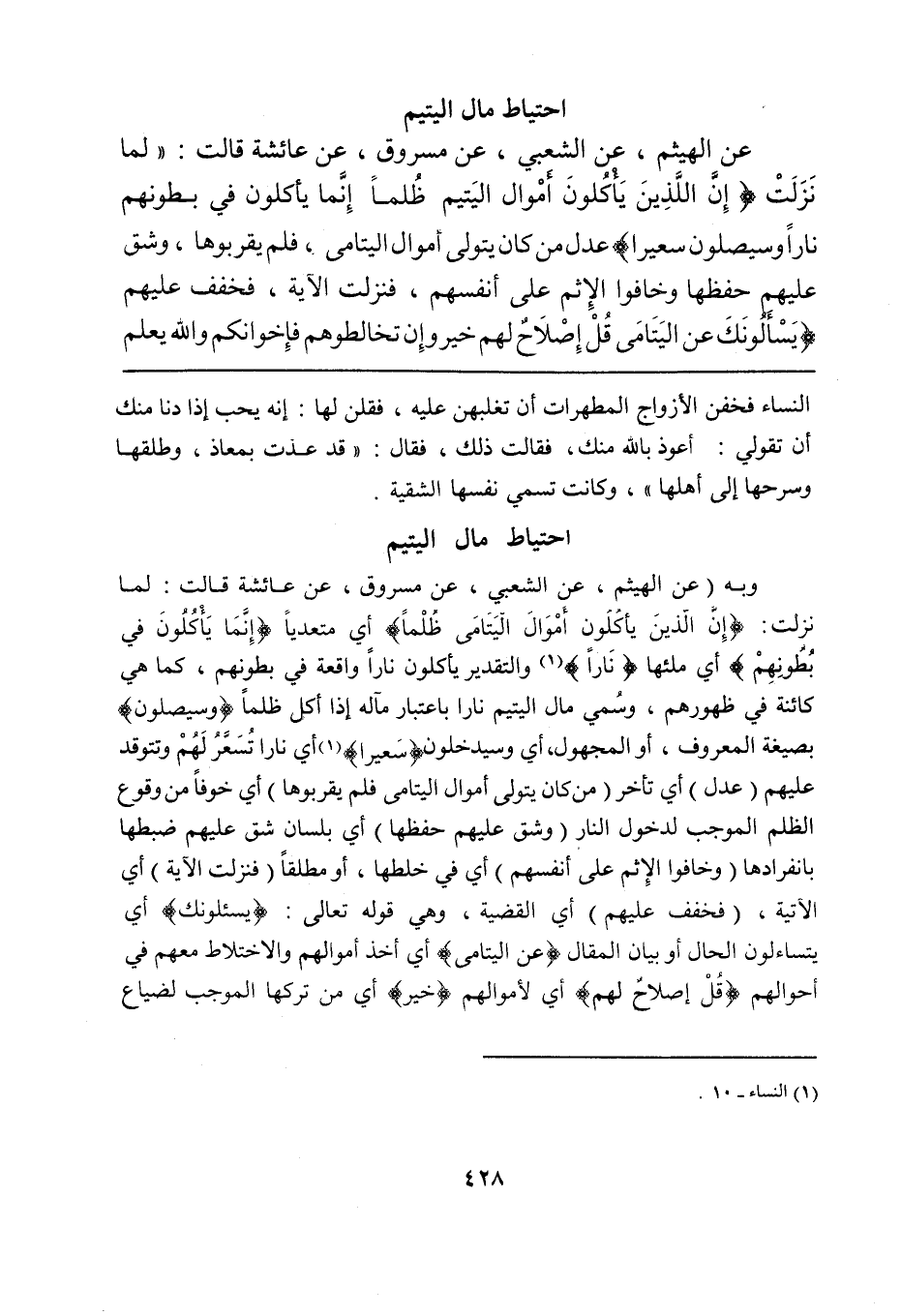 وبه (عن الهيثم، عن الشعبي، عن مسروق، عن عائشة قالت: لما نزلت: {إنَّ الذينَ يأكُلُون أَمْوَالَ اليَتامَى ظُلماً}) أي متعدياً ({إِنَّمَا يَأْكُلُونَ في بُطُونِهم}) أي ملئها ({نَاراً}) والتقدير يأكلون ناراً واقعة في بطونهم، كما هي كائنة في ظهورهم، وسُمي مال اليتيم ناراً باعتبار مآله إذا أكل ظلماً ({وسيصلون}) بصيغة المعروف، أو المجهول، أي وسيدخلون ({سَعيراً}) (¬1) أي ناراً تُسَعَّرُ لَهُم وتتوقد عليهم (عدل) أي تأخر (من كان يتولى أموال اليتامى فلم يقربوها) أي خوفاً من وقوع الظلم الموجب لدخول النار (وشق عليهم حفظها) أي بلسان شق عليهم ضبطها بانفرادها (وخافوا الإثم على أنفسهم) أي في خلطها، أو مطلقاً (فنزلت الآية) أي الآتية، (فخفف عليهم) أي القضية، وهي قوله تعالى: ({يسألونك}) أي يتساءلون الحال أو بيان المقال ({عن اليتامى}) أي أخذ أموالهم والاختلاط معهم في أحوالهم ({قُلْ إصلاحٌ لهم}) أي لأموالهم ({خير}) أي من تركها الموجب لضياع