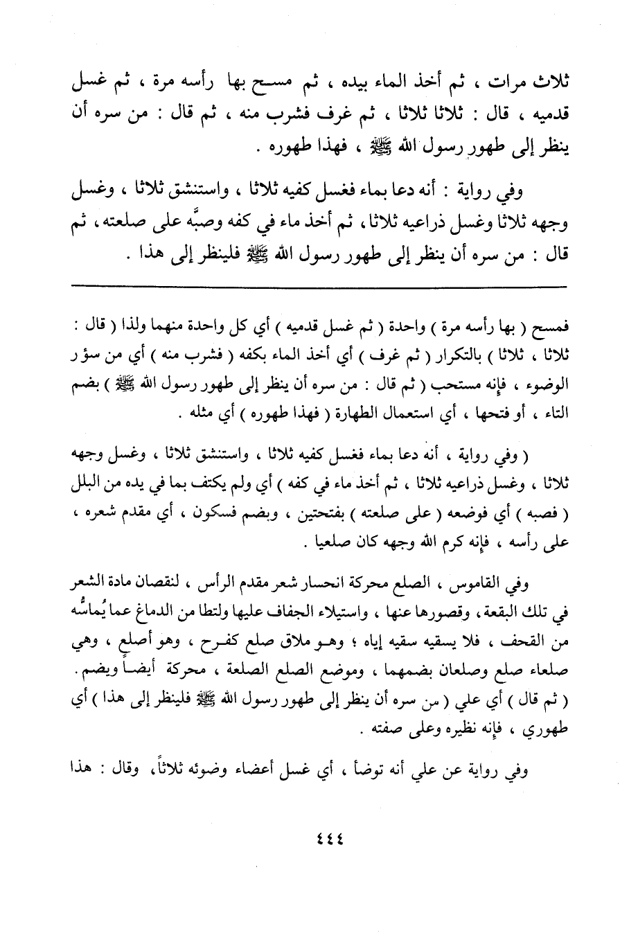 (وفي رواية، أنه دعا بماء فغسل كفيه ثلاثاً، واستنشق ثلاثاً، وغسل وجهه ثلاثاً، وغسل ذراعيه ثلاثاً، ثم أخذ ماء في كفه) أي ولم يكتف بما في يده من البلل (فصبه) أي فوضعه (على صلعته) بفتحتين، وبضم فسكون، أي مقدم شعره، على رأسه، فإنه كرم الله وجهه كان صلعاً.