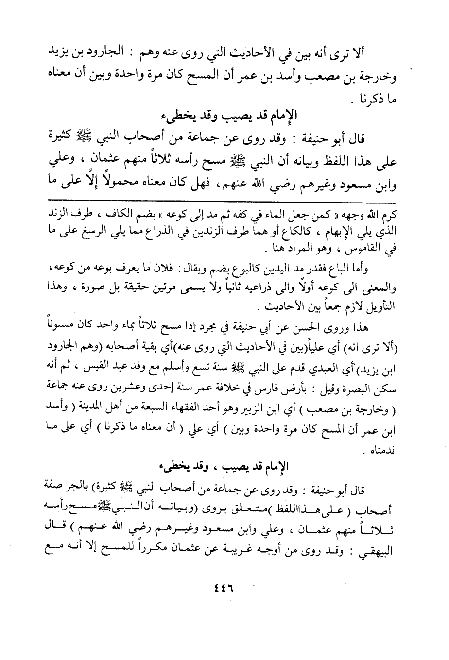 قال أبو حنيفة: وقد روى عن جماعة من أصحاب النبي صلى الله عليه وسلم كثيرة) بالجر صفة أصحاب (على هذا اللفظ) متعلق بروى (وبيانه أن النبي صلى الله عليه وسلم مسح رأسه ثلاثاً منهم عثمان، وعلي وابن مسعود وغيرهم رضي الله عنهم) قال البيهقي: وقد روى من أوجه غريبة عن عثمان مكرراً للمسح إلا أنه مع