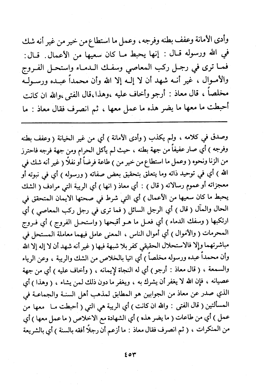 وصدق في كلامه، ولم يكذب (وأدى الأمانة) أي من غير الخيانة (وعفف بطنه وفرجه) أي صار عفيفاً من جهة بطنه، حيث لم يأكل الحرام ومن جهة فرجه فاحترز من الزنا ونحوه (وعمل ما استطاع من خير من) طاعة فرضاً أو نفلاً (غير أنه شك في الله) أي في توحيد ذاته وما يتعلق بتحقيق بعض صفاته (ورسوله) أي في نبوته أو معجزاته أو عموم رسالاته (قال): أي معاذ (إنها) أي الريبة التي مرادف (الشك يحبط ما كان سعيها من الأعمال) أي التي شرط في صحتها الإيمان المتحقق في الحال والمآل (قال) أي الرجل السائل (فما ترى في رجل ركب المعاصي) أي ارتكبها (وسفك الدماء) أي فعل ما هو أقبحها (واستحل الفروج) أي فروج المحرمات (والأموال) أي أموال الناس، المعنى عامل فيها معاملة المستحل في مباشرتهما وإلا فالاستحلال الحقيقي كفر بلا شبهة فيها (غير أنه شهد أن لا إله إلا الله وأن محمداً عبده ورسوله مخلصاً) أي أتيا بالخلاص من الشك والريبة، وعن الرياء والسمعة، (قال معاذ: أرجو) أي له النجاة لإيمانه، (وأخاف عليه) أي من جهة عصيانه، فإن الله لا يغفر أن يشرك به، ويغفر ما دون ذلك لمن يشاء، (وهذا) أي الذي صدر عن معاذ من الجوابين هو المطابق لمذهب أهل السنة والجماعة في المسألتين (قال الفتى: والله إن كانت) أي الريبة هي التي (أحبطت ما معها من عمل) أي من طاعات (ما يضر هذه) أي الشهادة مع الإخلاص (ما عمل معها) أي من المنكرات، (ثم انصرف فقال معاذ: ما أزعم أن رجلاً أفقه بالسنة) أي بالشريعة