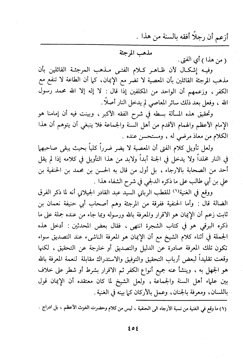 (¬1) ما وقع في الغنية من نسبة الإرجاء إلى الحنفية، ليس من كلام وحضرة الغوث الأعظم، بل إدراج.
