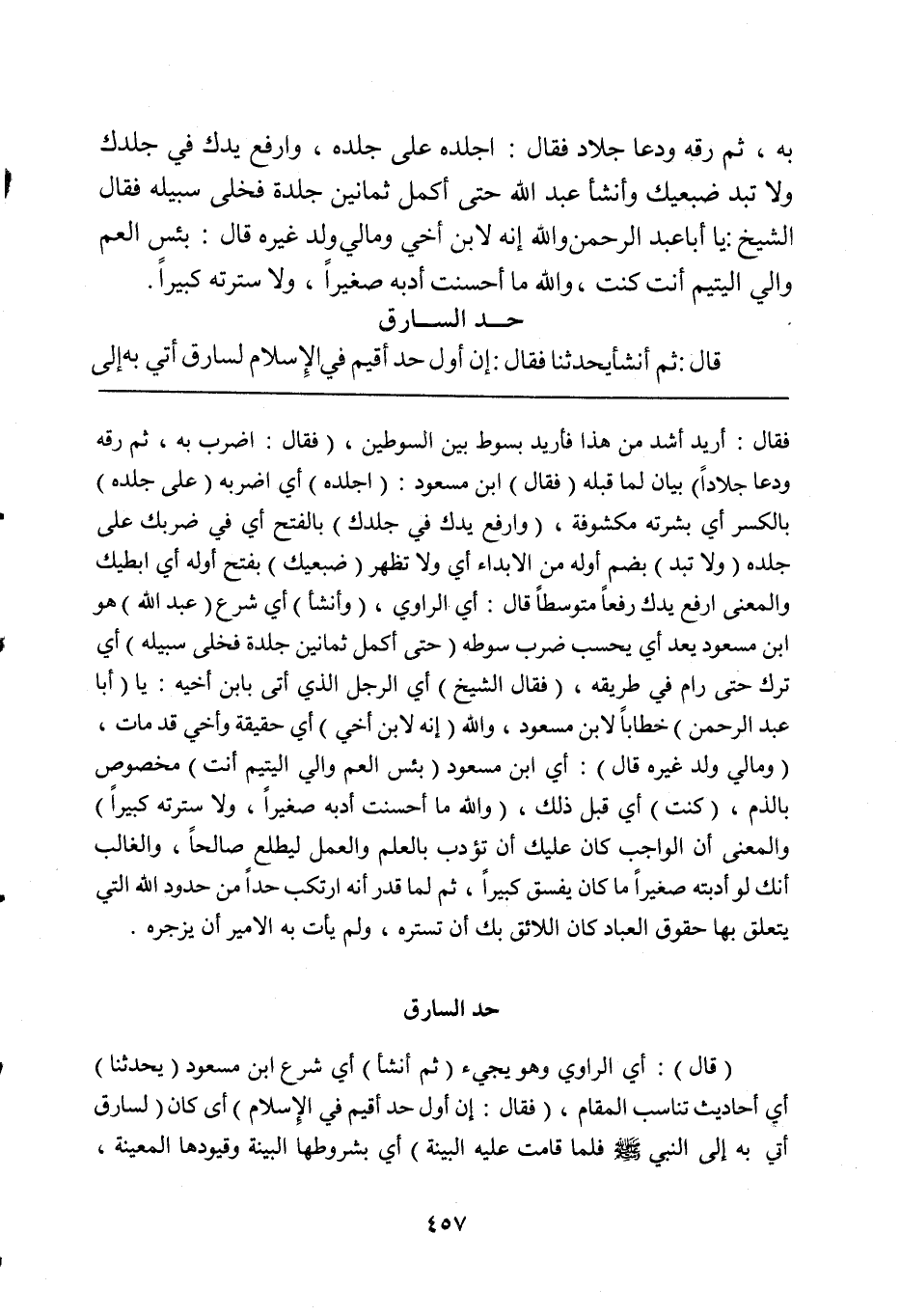 فقال: أريد أشد من هذا فأريد بسوط بين السوطين، (فقال: اضرب به، ثم رقه ودعا جلاداً) بيان لما قبله (فقال) ابن مسعود: (اجلده) أي اضربه (على جلده) بالكسر أي بشرته مكشوفة، (وارفع يدك في جلدك) بالفتح أي في ضربك على جلده (ولا تبد) بضم أوله من الإبداء أي ولا تظهر (ضبعيك) بفتح أوله أي إبطيك والمعنى ارفع يدك رفعاً متوسطاً قال: أي الراوي، (وأنشأ) أي شرع (عبد الله) هو ابن مسعود يعد أي يحسب ضرب سوطه (حتى أكمل ثمانين جلدة فخلى سبيله) أي ترك حتى رام في طريقه، (فقال الشيخ) أي الرجل الذي أتى بابن أخيه: يا (أبا عبد الرحمن) خطاباً لابن مسعود، والله (إنه لابن أخي) أي حقيقة وأخي قد مات، (ومالي ولد غيره قال): أي ابن مسعود (بئس العم والي اليتيم أنت) مخصوص بالذم، (كنت) أي قبل ذلك، (والله ما أحسنت أدبه صغيراً، ولا سترته كبيراً) والمعنى أن الواجب كان عليك أن تؤدب بالعلم والعمل ليطلع صالحاً، والغالب أنك لو أدبته صغيراً ما كان يفسق كبيراً، ثم لما قدر أنه ارتكب حداً من حدود الله التي يتعلق بها حقوق العباد كان اللائق بك أن تستره، ولم يأت به الأمير أن يزجره.