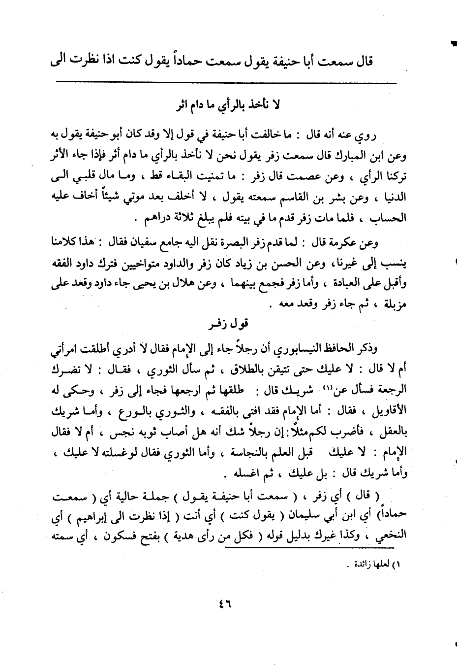 (قال) أي زفر، (سمعت أبا حنيفة يقول) جملة حالية أي (سمعت حماداً) أي ابن أبي سليمان (يقول كنت) أي أنت (إذا نظرت إلى إبراهيم) أي النخعي، وكذا غيرك بدليل قوله (فكل من رأى هديه) بفتح فسكون، أي سمته