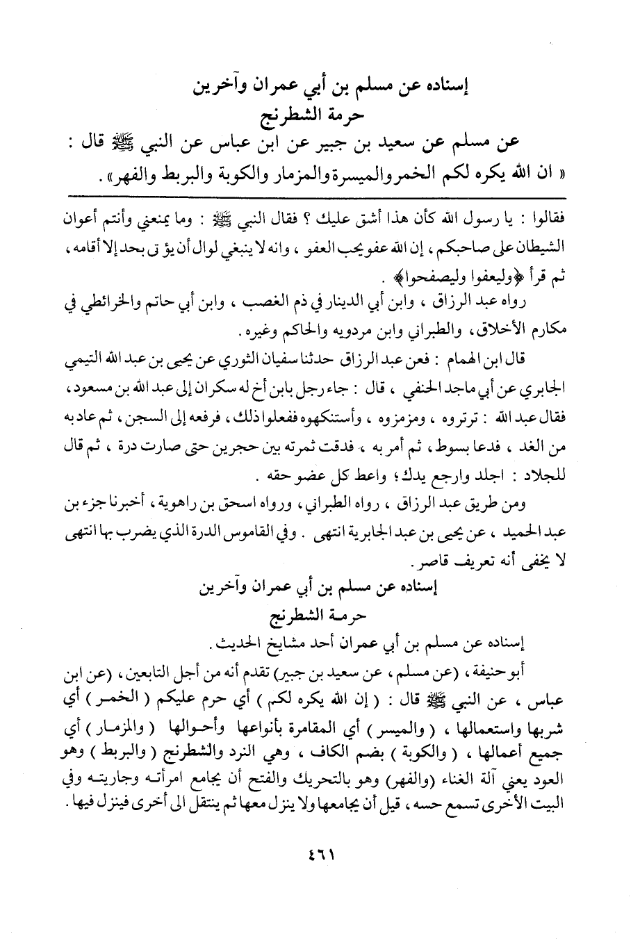 أبو حنيفة، (عن مسلم، عن سعيد بن جبير) تقدم أنه من أجل التابعين، (عن ابن عباس، عن النبي صلى الله عليه وسلم قال: "إن الله يكره لكم) أي حرم عليكم (الخمر) أي شربها واستعمالها، (والميسرة) أي المقامرة بأنواعها وأحوالها (والمزمار) أي جميع أعمالها، (والكوبة) بضم الكاف، وهى النرد والشطرنج (والبربط) وهو العود يعني آلة الغناء (والفهر") وهو بالتحريك والفتح أن يجامع امرأته وجاريته وفي البيت الأخرى تسمع حسه، قيل أن يجامعها ولا ينزل معها ثم ينتقل الى أخرى فينزل فيها.