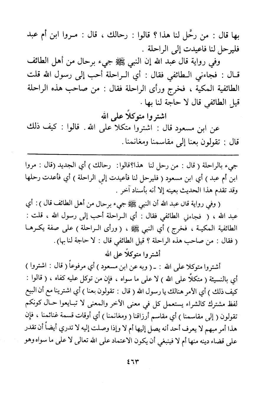 اشتروا متوكلاً على الله: - (وبه عن ابن مسعود) أي مرفوعاً (قال: اشتروا) أي بالنسيئة (متكلاً على الله) لا على ما سواه، فإن من توكل عليه كفاه، (قالوا: كيف ذلك) أي الأمر هنالك يا رسول الله (قال: تقولون بعنا) أي اشترينا مع أن البيع لفظ مشترك كالشراء يستعمل كل في معنى الآخر والمعنى لا تبايعوا حال كونكم تقولون (إلى مقاسمنا) أي مقاسم أرزاقنا (ومغانمنا) أي أوقات قسمة غنائمنا، فإن هذا أمر مبهم لا يعرف أحد أنه يصل إليها أم لا وإذا وصلت إليه لا تدري أيضاً أن تقدر على قضاء دينه منها أم لا فينبغي أن يكون الاعتماد على الله تعالى لا على ما سواه وهو