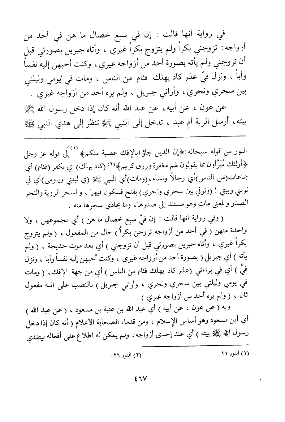النور من قوله سبحانه: {إن الذين جاؤوا بالإفك عصبة منكم} (¬1) إلى قوله عز وجل {أولئك مُبَرَّأون مما يقولون لهم مغفرة ورزق كريم} (¬2) (كاد يهلك) أي يكفر (فئام) أي جماعات (من الناس) أي رجالاً ونساء، (ومات) أي النبي صلى الله عليه وسلم (في ليلتي ويومي) أي في نوبتي وبيتي! (وتوفي بين سحري ونحري) بفتح فسكون فيهما، والسحر الروية والنحر الصدر. والمعنى مات وهو مستند إلى صدرها، وما يحاذي سحرها منه.