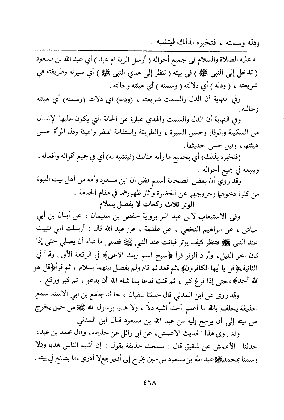 وفي الاستيعاب لابن عبد البر برواية حفص بن سليمان، عن أبان بن أبي عياش، عن إبراهيم النخعي، عن علقمة، عن عبد الله قال: أرسلت أمي لتبيت عند النبي صلى الله عليه وسلم فتنظر كيف يوتر فباتت عند النبي صلى الله عليه وسلم فصلى ما شاء أن يصلي حتى إذا كان آخر الليل، وأراد الوتر قرأ {سبح اسم ربك الأعلى} في الركعة الأولى وقرأ في الثانية {قل يا أيها الكافرون}، ثم قعد ثم قام ولم يفصل بينهما بسلام، ثم قرأ {قل هو الله أحد}، حتى إذا فرغ كبر، ثم قنت فدعا بما شاء الله أن يدعو، ثم كبر وركع.