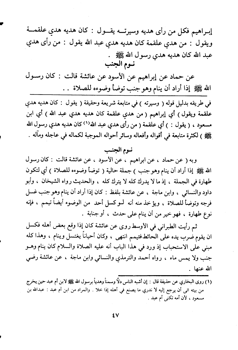 وبه (عن حماد، عن إبراهيم، عن الأسود، عن عائشة قالت: كان رسول الله صلى الله عليه وسلم إذا أراد أن ينام وهو جنب) جملة حالية (توضأ وضوءه للصلاة) أي لتكون طهارة في الجملة، إذ ما لا يدرك كله لا يترك كله، والحديث رواه الشيخان، وأبو داود والنسائي، وابن ماجه، عن عائشة بلفظ: كان إذا أراد أن ينام وهو جنب غسل فرجه وتوضأ للصلاة، ويؤخذ منه أنه لو كسل أحد من الوضوء أيضاً تيمم، فإنه نوع طهارة، فهو خير من أن ينام على حدث، أو جنابة.