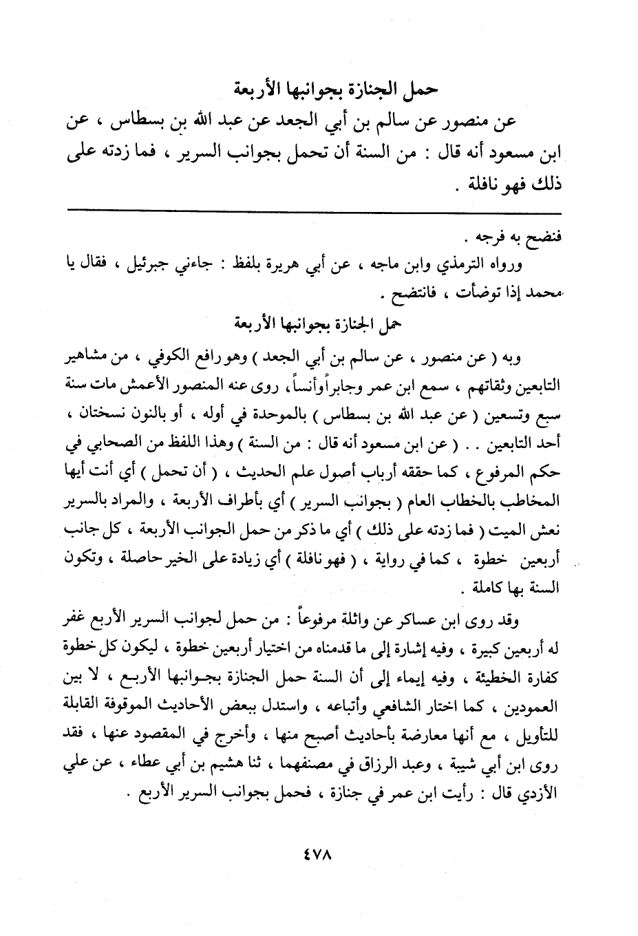 وقد روى ابن عساكر عن واثلة مرفوعاً: من حمل لجوانب السرير الأربع غفر له أربعين كبيرة، وفيه إشارة إلى ما قدمناه من اختيار أربعين خطوة، ليكون كل خطوة كفارة الخطيئة، وفيه إيماء إلى أن السنة حمل الجنازة بجوانبها الأربع، لا بين العمودين، كما اختاره الشافعي وأتباعه، واستدل ببعض الأحاديث الموقوفة القابلة للتأويل، مع أنها معارضة بأحاديث أصح منها، وأخرج في المقصود عنها، فقد روى ابن أبي شيبة، وعبد الرزاق في مصنفهما، ثنا هشيم بن أبي عطاء، عن علي الأزدي قال: رأيت ابن عمر في جنازة، فحمل بجوانب السرير الأربع.