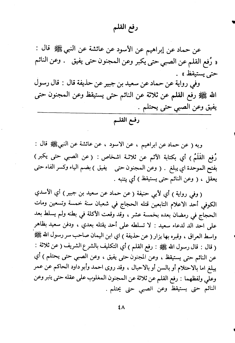 (وفي رواية) أي لأبي حنيفة (عن حماد عن سعيد بن جبير) أي الأسدي الكوفي أحد الأعلام التابعين قتله الحجاج في شعبان سنة خمسة وتسعين ومات الحجاج في رمضان بعده بخمسة عشر، وقد وقعت الأكلة في بطنه ولم يسلط بعد على أحد لدعاء سعيد: لا تسلطه على أحد يقتله بعدي، ودفن سعيد بظاهر واسط العراق، وقبره بها يزار (عن حذيفة) أي ابن اليمان صاحب سر رسول الله صلى الله عليه وسلم (قال: قال رسول الله صلى الله عليه وسلم: رفع القلم) أي التكليف بالشرع الشريف (عن ثلاثة: عن النائم حتى يستيقظ، وعن المجنون حتى يفيق، وعن الصبي حتى يحتلم) أي يبلغ إما بالإحتلام أو بالسن أو بالإحبال، وقد روى أحمد وأبو داود الحاكم عن عمر وعلي ولفظهما: رفع القلم عن ثلاثة عن المجنون المغلوب على عقله حتى يتبر وعن النائم حتى يستيقظ وعن الصبي حتى يحتلم.