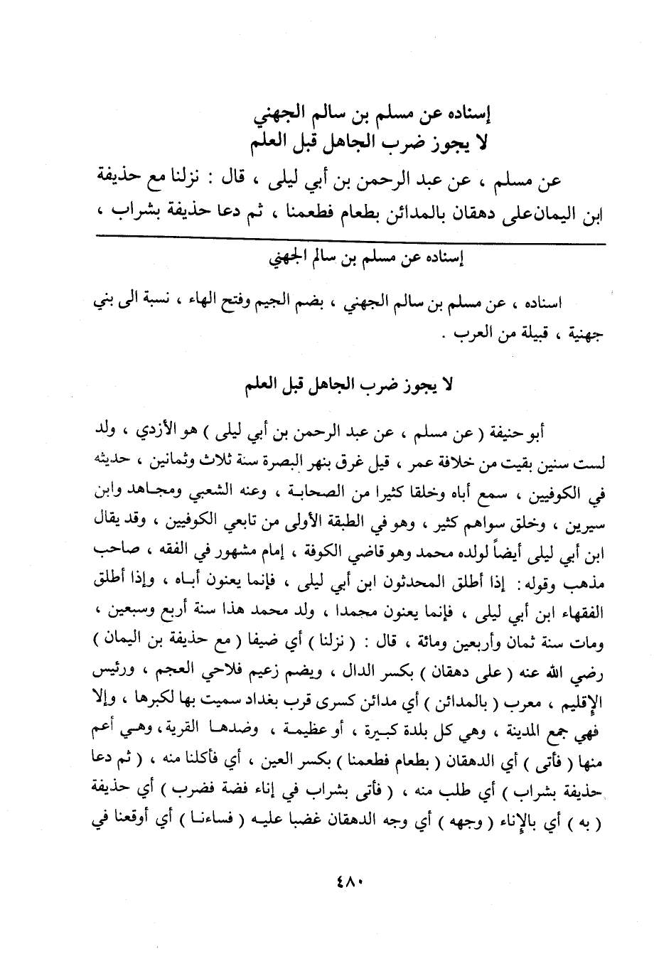 أبو حنيفة (عن مسلم، عن عبد الرحمن بن أبي ليلى) هو الأزدي، ولد لست سنين بقيت من خلافة عمر، قيل غرق بنهر البصرة سنة ثلاث وثمانين، حديثه في الكوفيين، سمع أباه وخلقاً كثيراً من الصحابة، وعنه الشعبي ومجاهد وابن سيرين، وخلق سواهم كثير، وهو في الطبقة الأولى من تابعي الكوفيين، وقد يقال ابن أبي ليلى أيضاً لولده محمد وهو قاضي الكوفة، إمام مشهور في الفقه، صاحب مذهب وقوله: إذا أطلق المحدثون ابن أبي ليلى، فإنما يعنون أباه، وإذا أطلق الفقهاء ابن أبي ليلى، فإنما يعنون محمداً، ولد محمد هذا سنة أربع وسبعين، ومات سنة ثمان وأربعين ومائة، قال: (نزلنا) أي ضيفاً (مع حذيفة بن اليمان) رضي الله عنه (على دهقان) بكسر الدال، ويضم زعيم فلاحي العجم، ورئيس الإقليم، معرب (بالمدائن) أي مدائن كسرى قرب بغداد سميت بها لكبرها، وإلا فهي جمع المدينة، وهي كل بلدة كبيرة، أو عظيمة، وضدها القرية، وهي أعم منها (فأتى) أي الدهقان (بطعام فطعمنا) بكسر العين، أي فأكلنا منه، (ثم دعا حذيفة بشراب) أي طلب منه، (فأتى بشراب في إناء فضة فضرب) أي حذيفة (به) أي بالإناء (وجهه) أي وجه الدهقان غضباً عليه (فساءنا) أي أوقعنا في