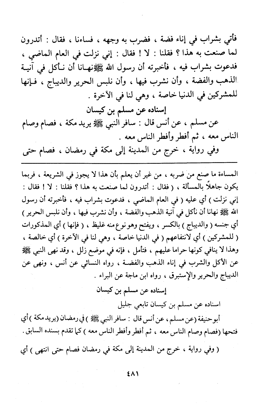 أبو حنيفة (عن مسلم، عن أنس قال: سافر النبي صلى الله عليه وسلم) في رمضان (يريد مكة) أي فتحها (فصام وصام الناس معه، ثم أفطر وأفطر الناس معه) كما تقدم بسنده السابق.