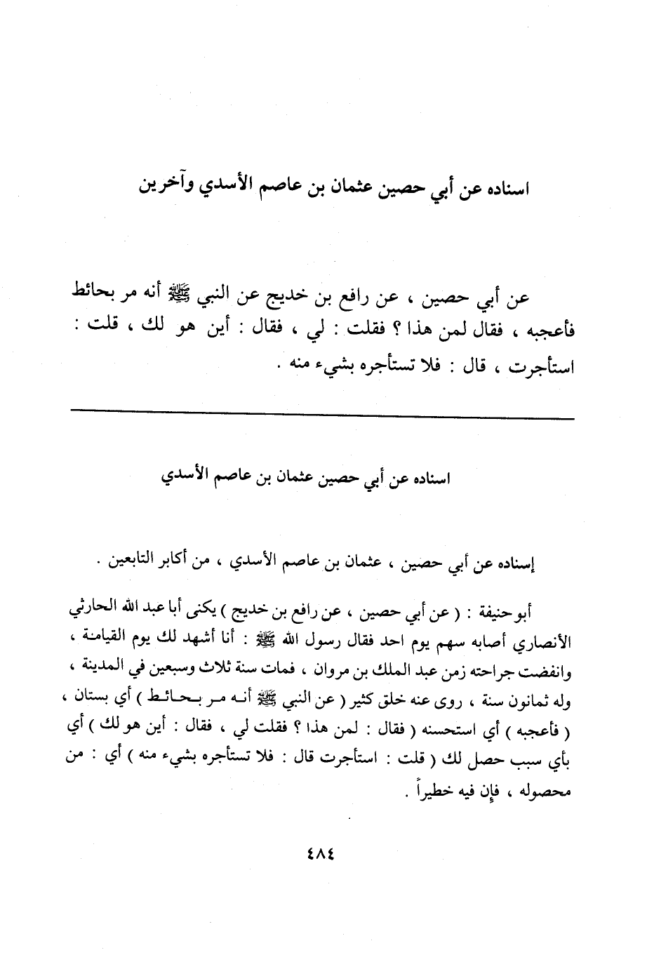 أبو حنيفة: (عن أبي حصين، عن رافع بن خديج) يكنى أبا عبد الله الحارثي الأنصاري أصابه سهم يوم أحد فقال رسول الله صلى الله عليه وسلم: أنا أشهد لك يوم القيامة، وانفضت جراحته زمن عبد الملك بن مروان، فمات سنة ثلاث وسبعين في المدينة، وله ثمانون سنة، روى عنه خلق كثير (عن النبي صلى الله عليه وسلم أنه مر بحائط) أي بستان، (فأعجبه) أي استحسنه (فقال: لمن هذا؟ فقلت لي، فقال: أين هو لك) أي بأي سبب حصل لك (قلت: استأجرت قال: فلا تستأجره بشيء منه) أي: من محصوله، فإن فيه خطيراً.