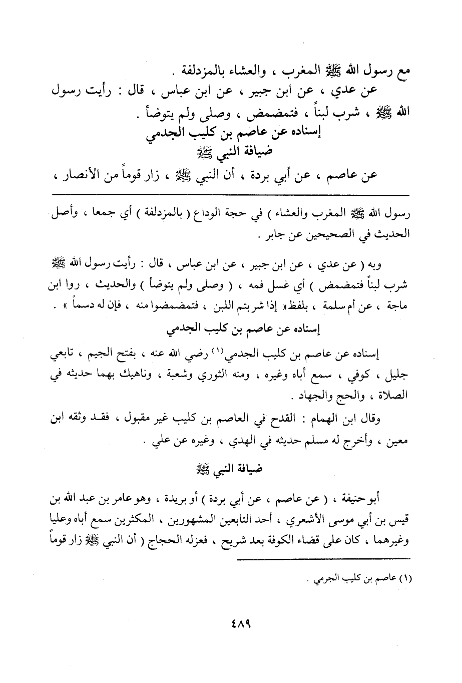 أبو حنيفة، (عن عاصم، عن أبي بردة) أو بريدة، وهو عامر بن عبد الله بن قيس بن أبي موسى الأشعري، أحد التابعين المشهورين، المكثرين سمع أباه وعلياً وغيرهما، كان على قضاء الكوفة بعد شريح، فعزله الحجاج (أن النبي صلى الله عليه وسلم زار قوماً