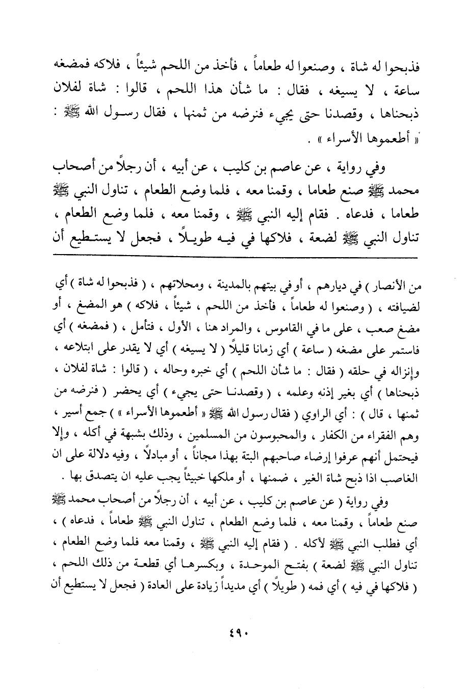 وفي رواية (عن عاصم بن كليب، عن أبيه، أن رجلاً من أصحاب محمد صلى الله عليه وسلم صنع طعاماً، وقمنا معه، فلما وضع الطعام، تناول النبي صلى الله عليه وسلم طعاماً فدعاه)، أي فطلب النبي صلى الله عليه وسلم لأكله. (فقام إليه النبي صلى الله عليه وسلم، وقمنا معه فلما وضع الطعام، تناول النبي صلى الله عليه وسلم لضغة) بفتح الموحدة، وبكسرها أي قطعة من ذلك اللحم، (فلاكها في فيه) أي فمه (طويلاً) أي مديداً زيادة على العادة (فجعل لا يستطيع أن