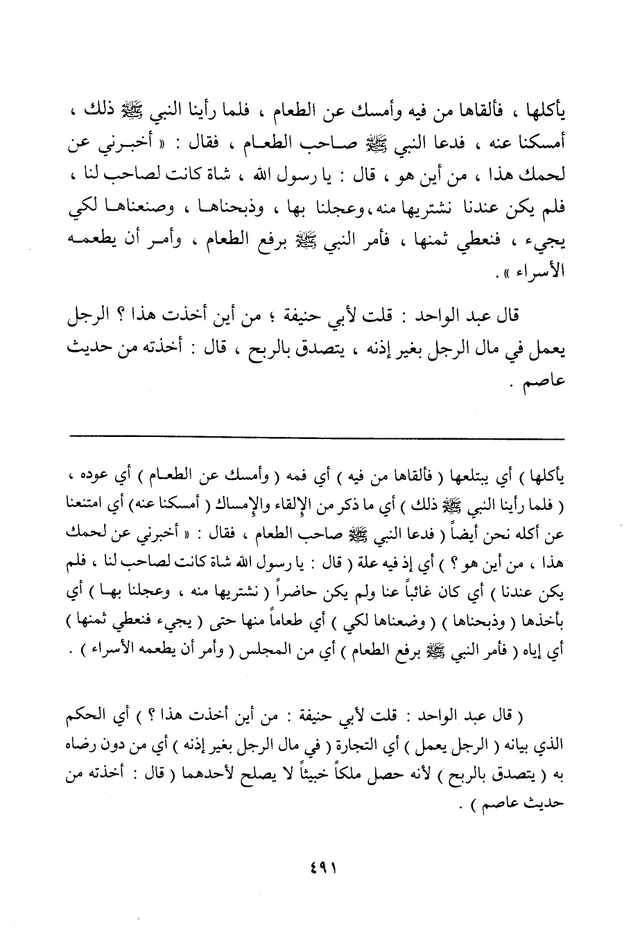 يأكلها) أي يبتلعها (فألقاها من فيه) أي فمه (وأمسك عن الطعام) أي عوده، (فلما رأينا النبي صلى الله عليه وسلم ذلك) أي ما ذكر من الإلقاء والإمساك (أمسكنا عنه) أي امتنعنا عن أكله نحن أيضاً (فدعا النبي صلى الله عليه وسلم صاحب الطعام، فقال: "أخبرني عن لحمك هذا، من أين هو؟) أي إذ فيه علة (قال: يا رسول الله شاة كانت لصاحب لنا، فلم يكن عندنا) أي كان غائباً عنا ولم يكن حاضراً (نشتريها منه، وعجلنا بها) أي بأخذها (وذبحناها وصنعناها لكي) أي طعاماً منها حتى (يجيء فنعطي ثمنها) أي إياه (فأمر النبي صلى الله عليه وسلم برفع الطعام) أي من المجلس (وأمر أن يطعمه الأسراء).
