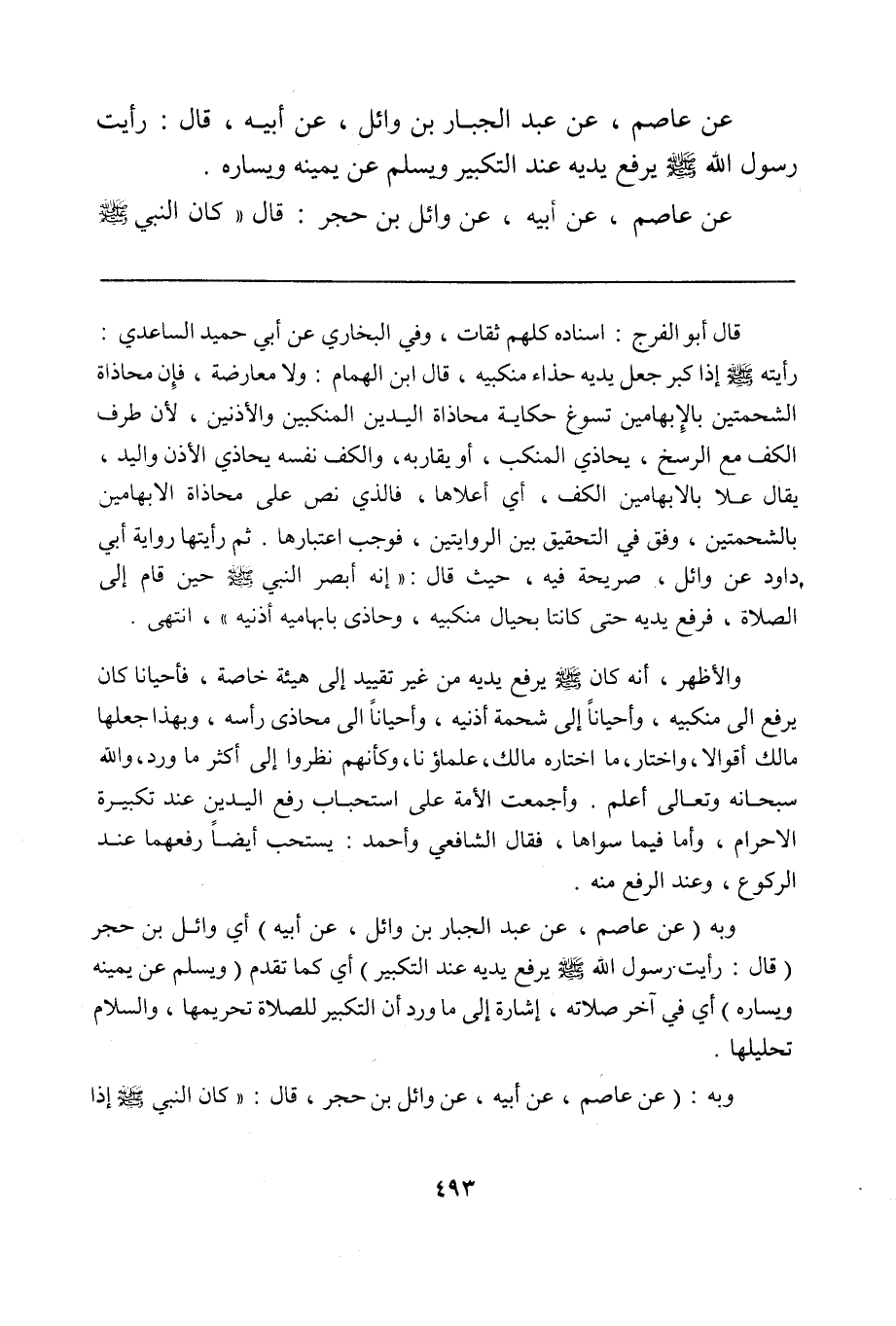 قال أبو الفرج: إسناده كلهم ثقات، وفي البخاري عن أبي حميد الساعدي: رأيته صلى الله عليه وسلم إذا كبر جعل يديه حذاء منكبيه، قال ابن الهمام: ولا معارضة، فإن محاذاة الشحمتين بالإبهامين تسوغ حكاية محاذاة اليدين المنكبين والأذنين، لأن طرف الكف مع الرسغ، يحاذي المنكب، أو يقاربه، والكف نفسه يحاذي الأذن واليد، يقال علا بالإبهامين الكف، أي أعلاها، فالذي نص على محاذاة الإبهامين بالشحمتين، وفق في التحقيق بين الروايتين، فوجب اعتبارها. ثم رأيتها رواية أبي داود عن وائل، صريحة فيه، حيث قال: "إنه أبصر النبي صلى الله عليه وسلم حين قام إلى الصلاة، فرفع يديه حتى كانتا بحيال منكبيه، وحاذى بإبهاميه أذنيه"، انتهى.