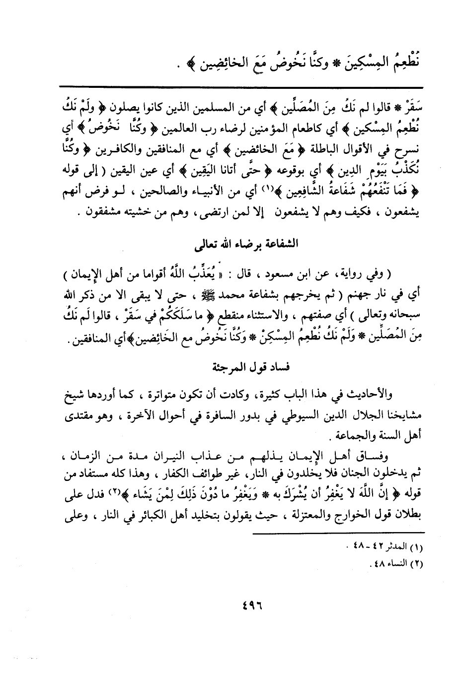 سَقَرْ ... قالوا لم نَكُ مِنَ المُصَلِّين}) أي من المسلمين الذين كانوا يصلون ({ولَمْ نَكُ نُطْعِمُ المِسْكين}) أي كإطعام المؤمنين لرضاء رب العالمين ({وكُنَّا نَخُوضُ}) أي نسرح في الأقوال الباطلة ({مَعَ الخائضين}) أي مع المنافقين والكافرين ({وكُنَّا نُكَذْبُ بيَومِ الدِين}) أي بوقوعه ({حتَّى أتانا اليَقِين}) أي عين اليقين (إلى قوله {فَمَا تَنْفَعُهُمْ شَفَاعةُ الشَّافِعِين}) (¬1) أي من الأنبياء والصالحين، لو فرض أنهم يشفعون، فكيف وهم لا يشفعون إلا لمن ارتضى، وهم من خشيته مشفقون.