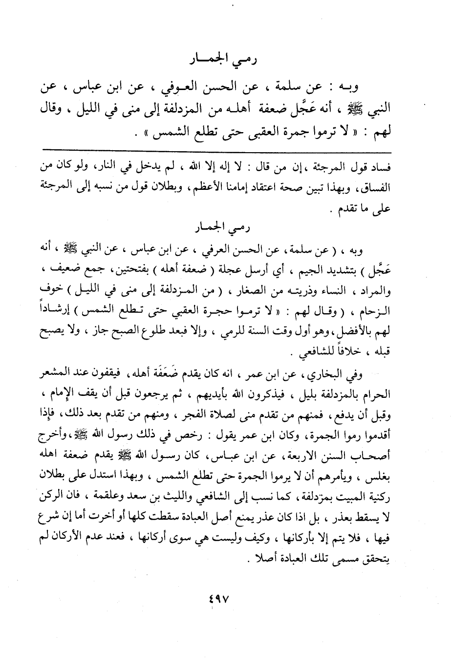 وفي البخاري، عن ابن عمر، أنه كان يقدم ضَعَفَة أهله، فيقفون عند المشعر الحرام بالمزدلفة بليل، فيذكرون الله بأيديهم، ثم يرجعون قبل أن يقف الإمام، وقبل أن يدفع، فمنهم من تقدم منى لصلاة الفجر، ومنهم من تقدم بعد ذلك، فإذا أقدموا رموا الجمرة، وكان ابن عمر يقول: رخص في ذلك رسول الله صلى الله عليه وسلم، وأخرج أصحاب السنن الأربعة، عن ابن عباس، كان رسول الله صلى الله عليه وسلم يقدم ضعفة أهله بغلس، ويأمرهم أن لا يرموا الجمرة حتى تطلع الشمس، وبهذا استدل على بطلان ركنية المبيت بمزدلفة، كما نسب إلى الشافعي والليث بن سعد وعلقمة، فإن الركن لا يسقط بعذر، بل إذا كان عذر يمنع أصل العبادة سقطت كلها أو أخرت أما إن شرع فيها، فلا يتم إلا بأركانها، وكيف وليست هي سوى أركانها، فعند عدم الأركان لم يتحقق مسمى تلك العبادة أصلاً.
