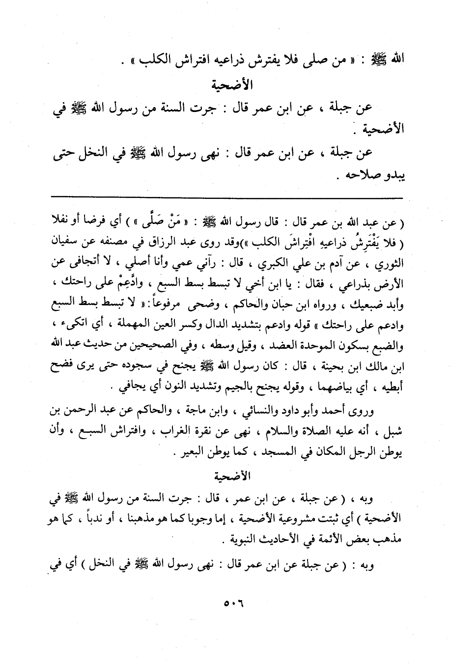 (عن عبد الله بن عمر قال: قال رسول الله صلى الله عليه وسلم: "مَنْ صَلَّى") أي فرضاً أو نفلاً (فلا يَفْتَرِشُ ذراعيهِ افْتِراشَ الكلب") وقد روى عبد الرزاق في مصنفه عن سفيان الثوري، عن آدم بن علي الكبري، قال: رآني عمي وأنا أصلي، لا أتجافى عن الأرض بذراعي، فقال: يا ابن أخي لا تبسط بسط السبع، وادَّعِم على راحتك، وأبد ضبعيك، ورواه ابن حبان والحاكم، وضحى مرفوعاً: "لا تبسط بسط السبع وادعم على راحتك" قوله وادعم بتشديد الدال وكسر العين المهملة، أي اتكىء، والضبع بسكون الموحدة العضد، وقيل وسطه، وفي الصحيحين من حديث عبد الله ابن مالك ابن بحينة، قال: كان رسول الله صلى الله عليه وسلم يجنح في سجوده حتى يرى فضح إبطيه، أي بياضهما، وقوله يجنح بالجيم وتشديد النون أي يجافي.